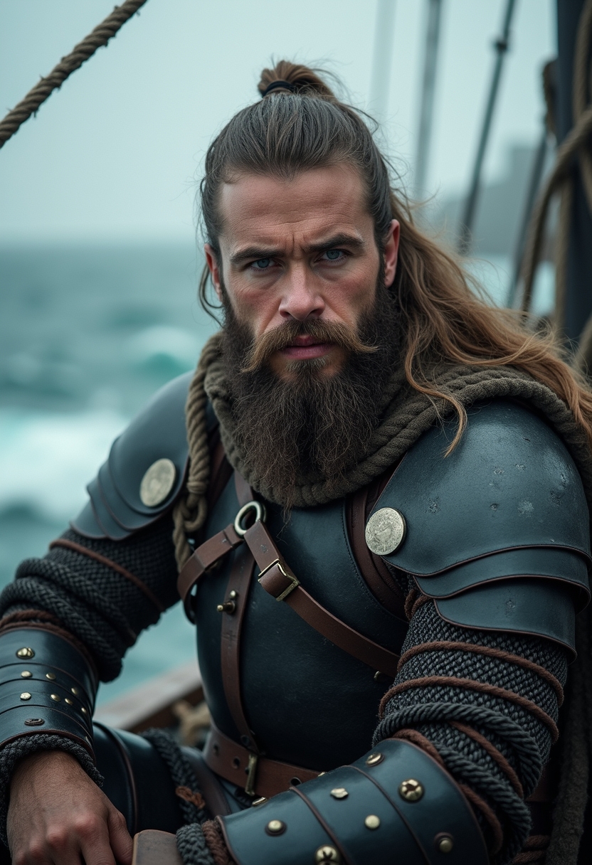 Мужчина, одетый в доспехи викинга, на борту лодки посреди бурного моря. Его длинные волосы собраны в хвост, а густая борода и усы дополняют суровый образ. Доспехи состоят из кожаной брони, кольчуги и металлических пластин, украшенных заклепками. Мужчина держится за толстый канат, его взгляд направлен прямо на зрителя, выражая уверенность и силу. Освещение драматичное, с контрастом между темными тонами одежды и светлой кожей лица, подчеркивающим детали доспехов и текстуры. Атмосфера мрачная и суровая, соответствует образу бушующего моря и сурового воина. Общее настроение изображения – эпическое и героическое.