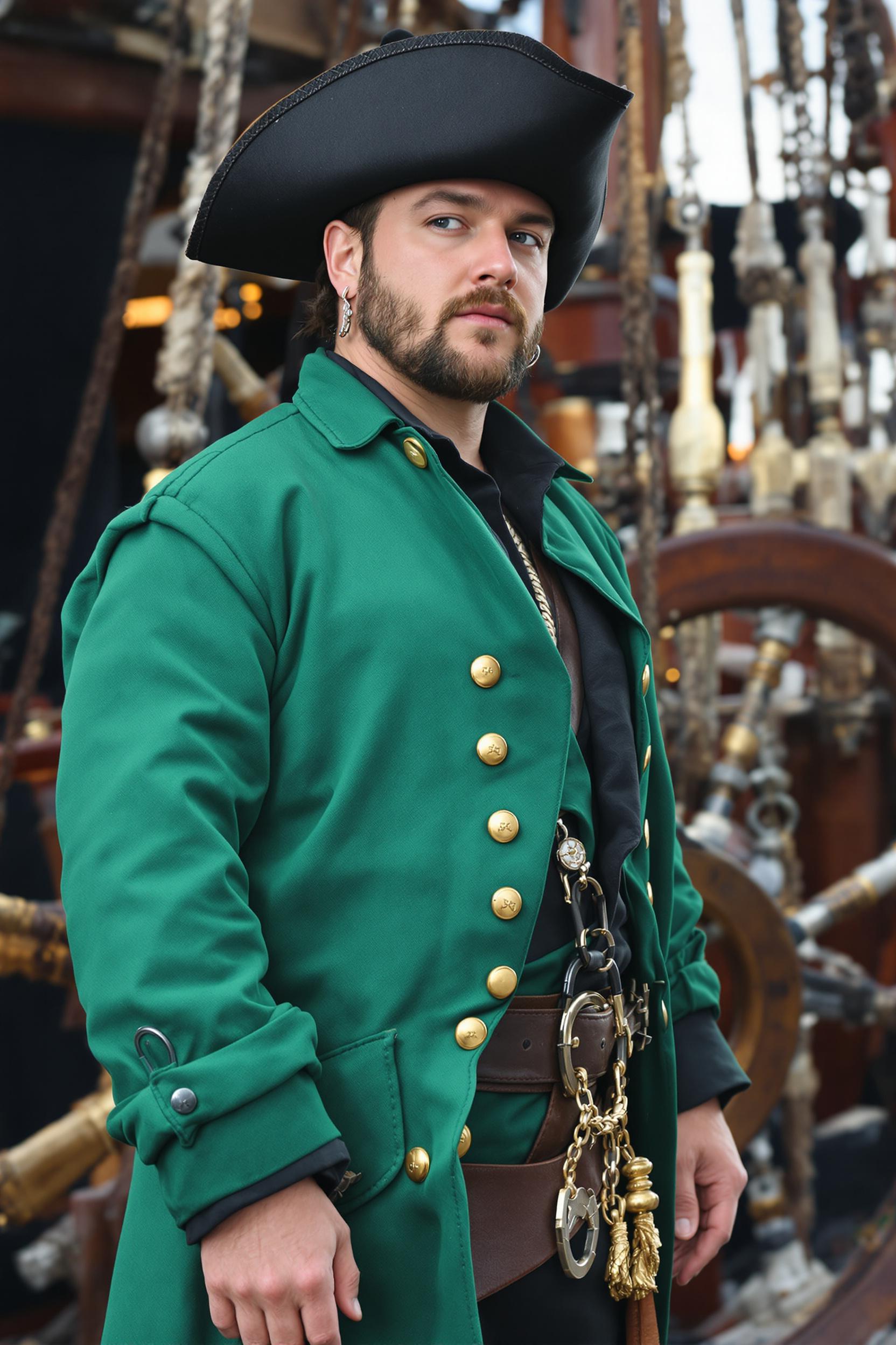 Мужчина-пират в изумрудно-зеленом длинном пальто с золотыми пуговицами, под ним чёрная рубаха с разрезом у воротника, коричневый кожаный ремень с пряжкой, шляпа с широкими полями и золотой цепочкой, серебряная серьга, стоит на фоне штурвала, средний план, смотрит в камеру.