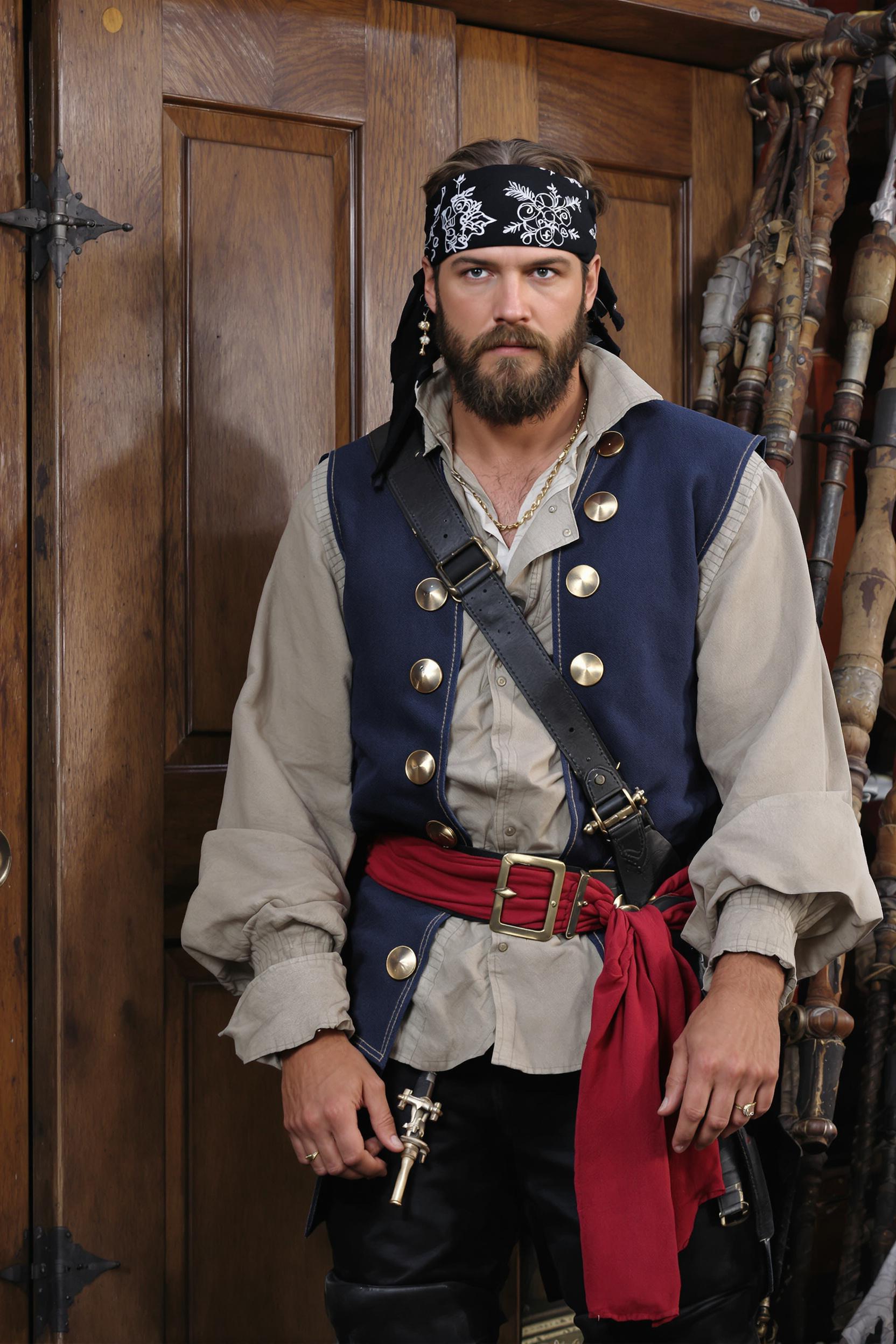 Мужчина-пират в светло-коричневой холщовой рубахе с длинными рукавами, тёмно-синей безрукавке, широком алом поясе, кожаных штанах и высоких сапогах, чёрная бандана с белым узором, кольцо на пальце, стоит у деревянной корабельной двери, пристально смотрит в камеру, средний план.