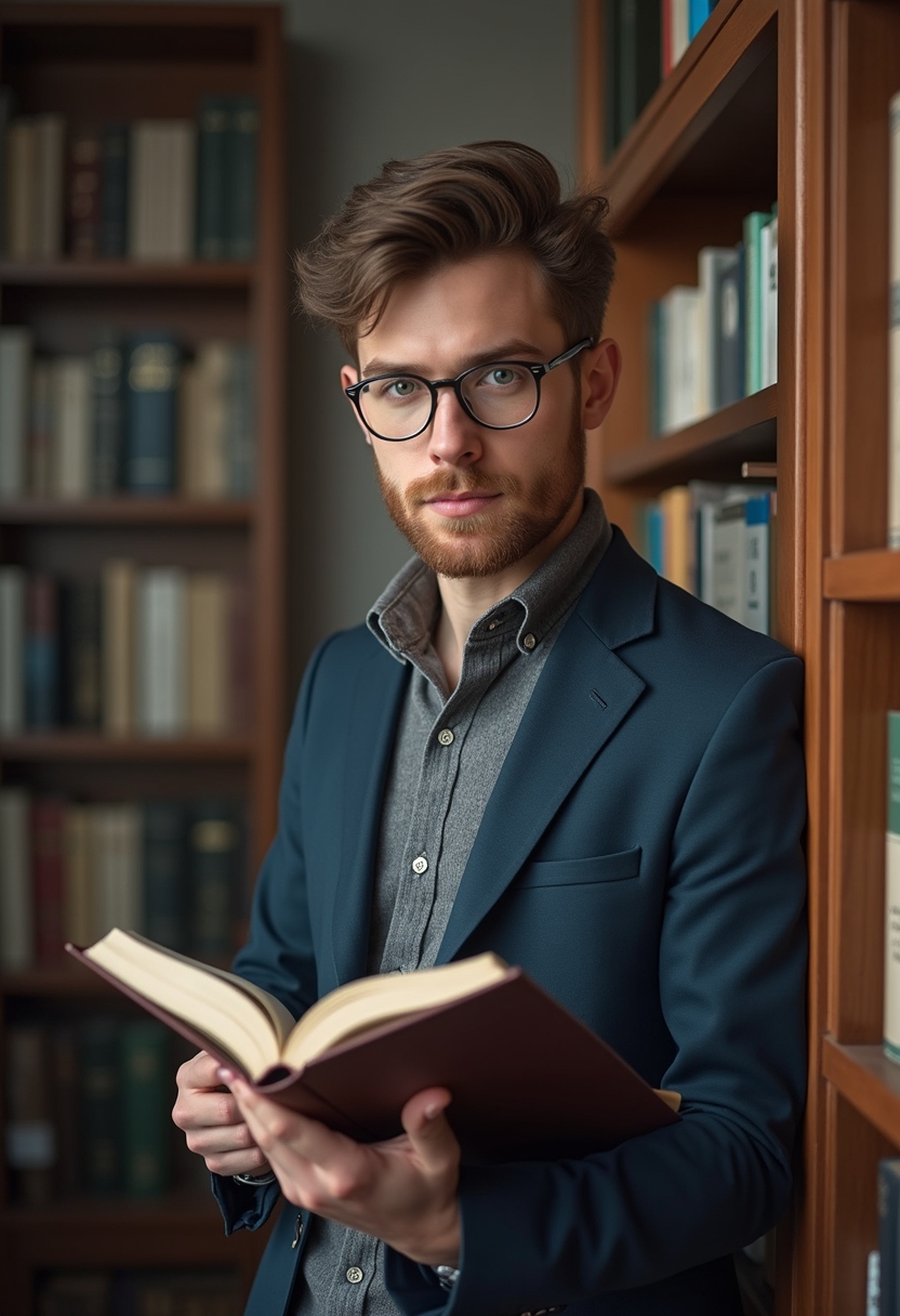Примерить образ на себеМужчина-психолог в очках стоит у книжной полки, держит книгу в руках, смотрит в камеру, фон – кабинет