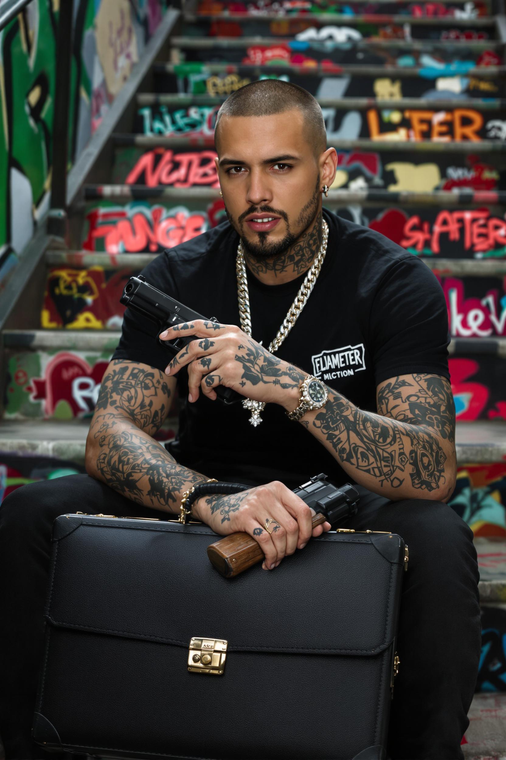 Мужчина-рэпер с грилзами и татуировками держит в одной руке кейс с деньгами, в другой — муляж пистолета, сидит на лестнице с граффити. Он смотрит в камеру свысока. Крупный план, пафос и уличная энергетика.
