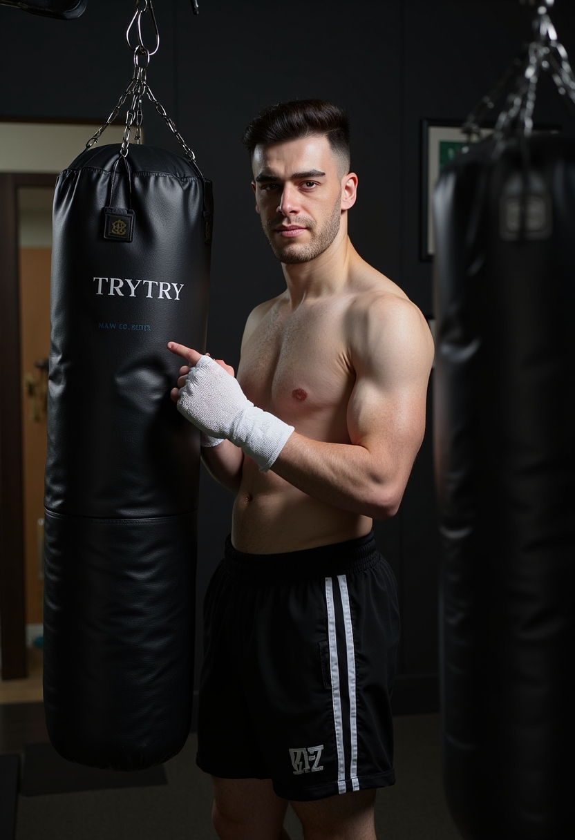 Мужчина с бинтами на руках стоит в тёмном зале на фоне боксерской груши, смотрит прямо в камеру