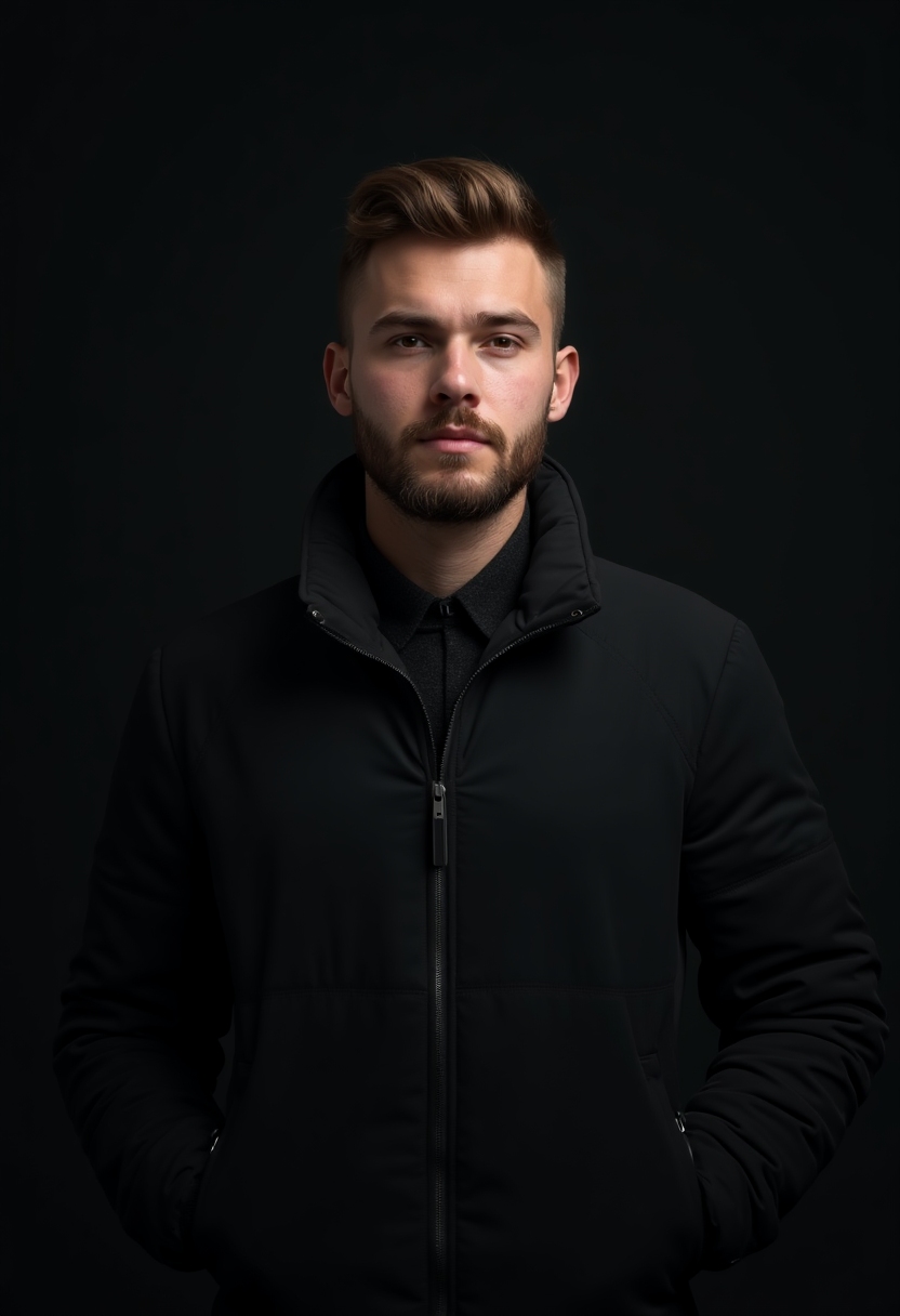 Мужчина с бородой и в темном пиджаке на черном фоне с мягким освещением, прямо смотрит в камеру