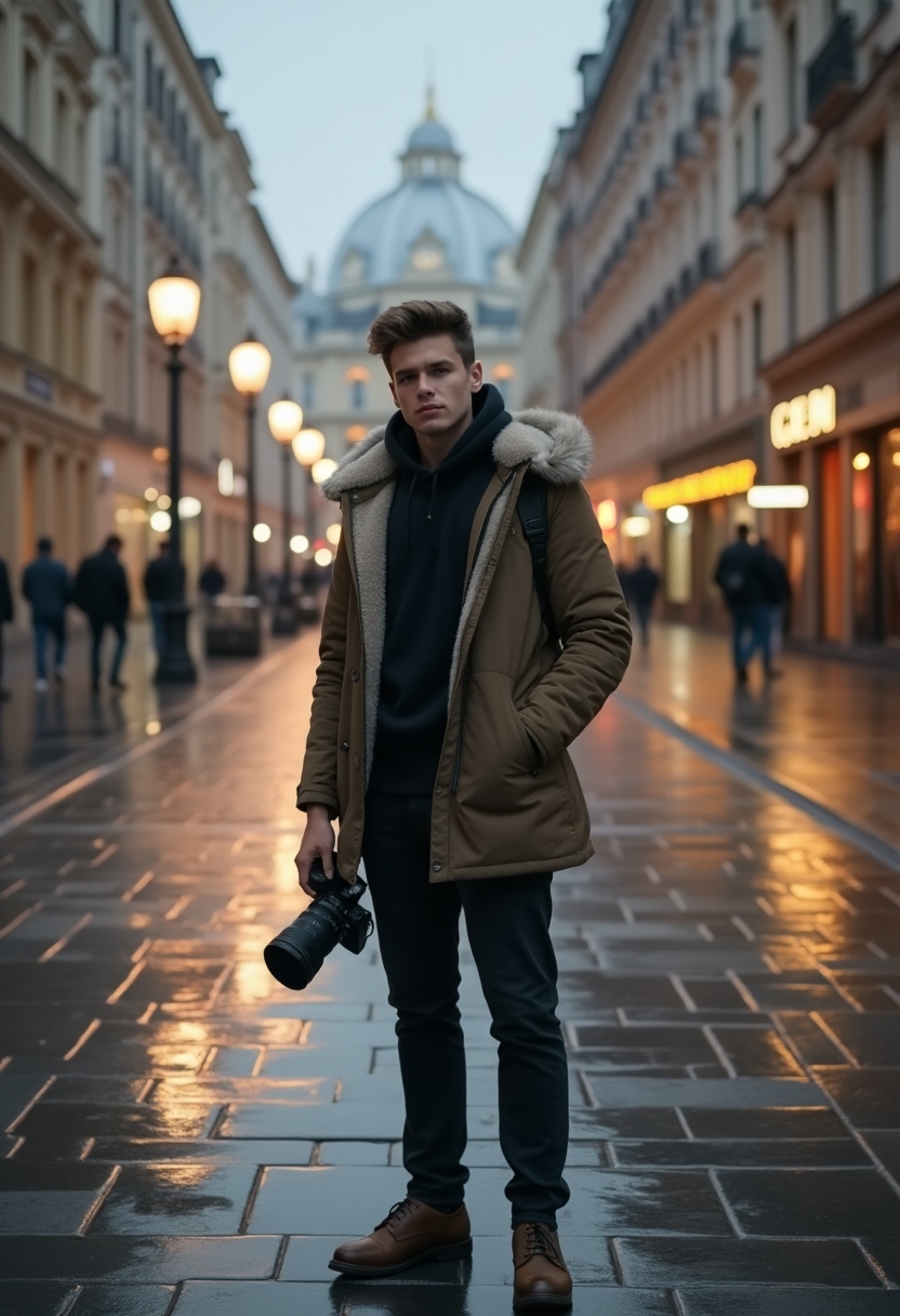 Мужчина с фотоаппаратом стоит перед ГУМом, фасад которого отражается в лужах на площади, вокруг лёгкий вечерний туман
