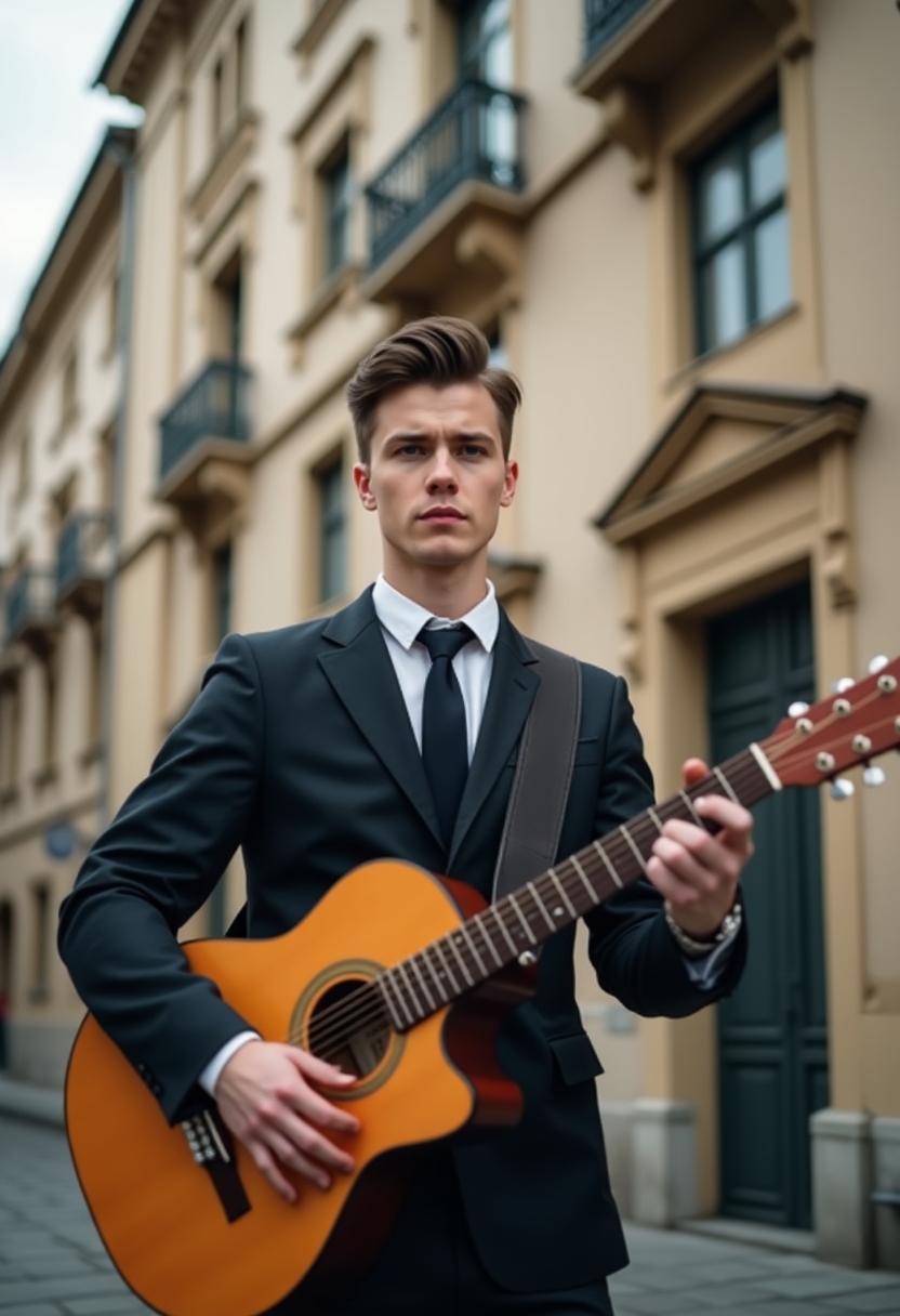 Мужчина с гитарой в руках стоит у исторического здания с декоративными окнами и балконами, смотрит прямо в камеру