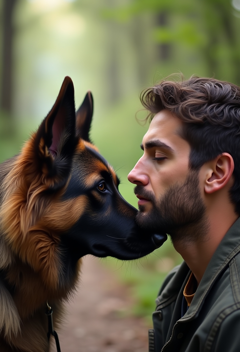 Мужчина с густой щетиной прижимается лбом к морде немецкой овчарки, его глаза закрыты, а собака спокойно смотрит вбок. Её уши прижаты, создавая ощущение доверия. Позади лесная тропа, мягкий дневной свет пробивается сквозь ветви.