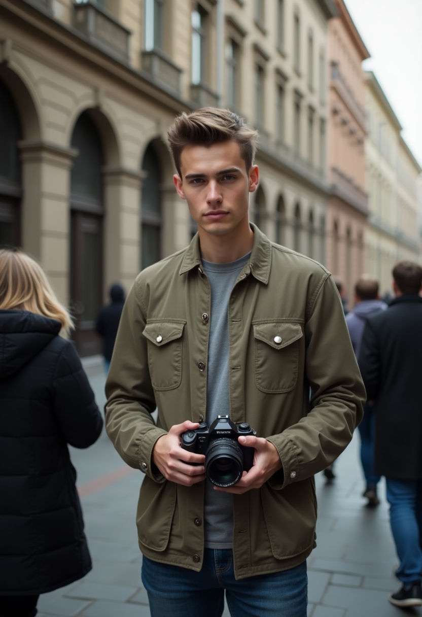Мужчина с камерой в руках стоит у фасада старинного дома, украшенного лепниной, смотрит прямо в камеру, вокруг прохожие
