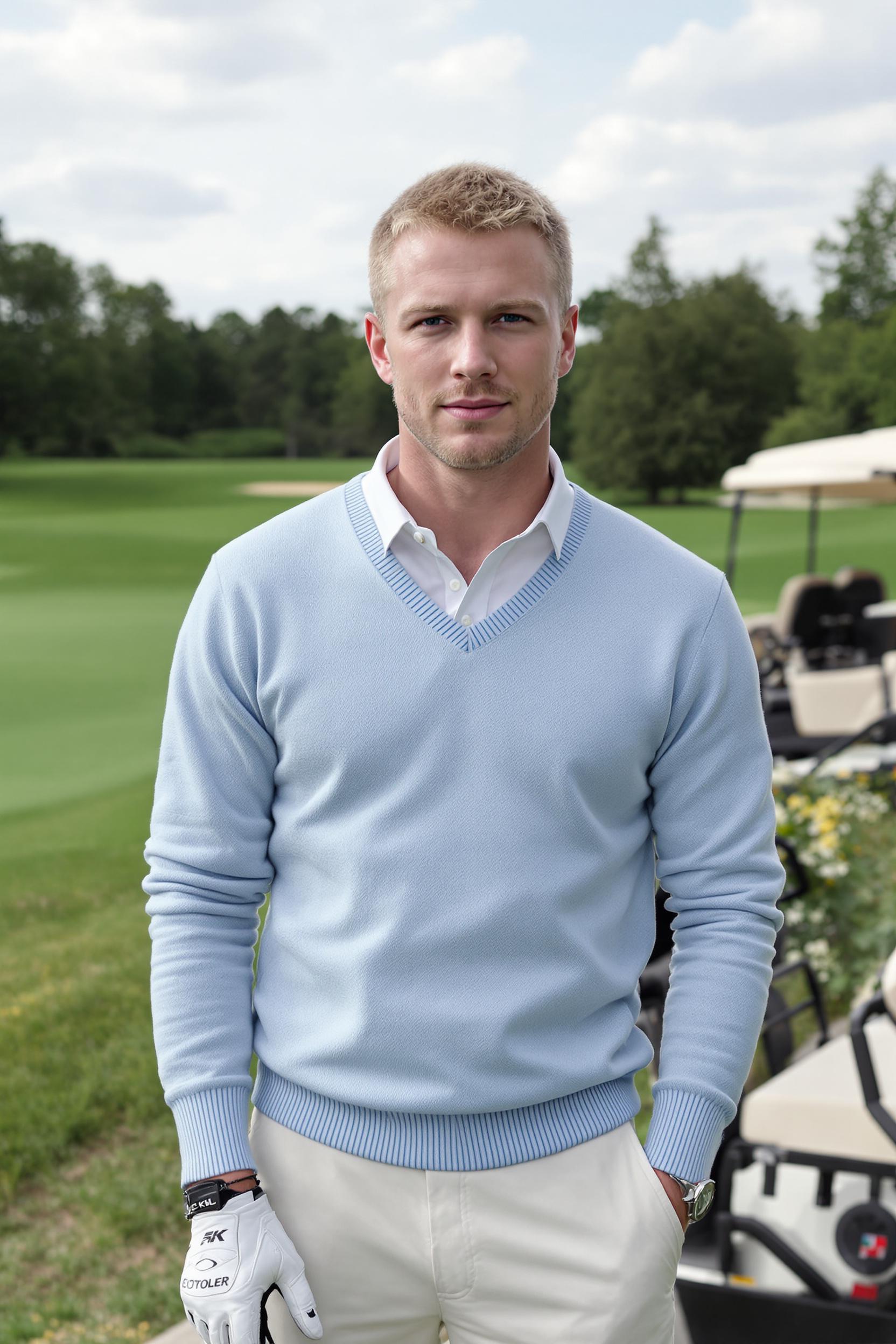 Мужчина с короткими волосами и лёгкой щетиной стоит у поля для гольфа на фоне аккуратно подстриженной зелёной лужайки и гольф-мобиля. На нём светло-синий джемпер с V-образным вырезом поверх белой рубашки и кремовые брюки. В руках перчатка для гольфа, взгляд прямо в камеру. Средний план.