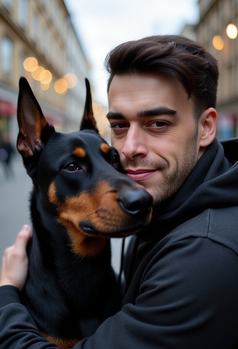Мужчина с лёгкой улыбкой смотрит в камеру, одной рукой обнимая морду добермана, который внимательно смотрит вдаль. Их головы находятся близко друг к другу, подчёркивая связь. Позади размытая городская улица, вечернее освещение создаёт контрастные тени.