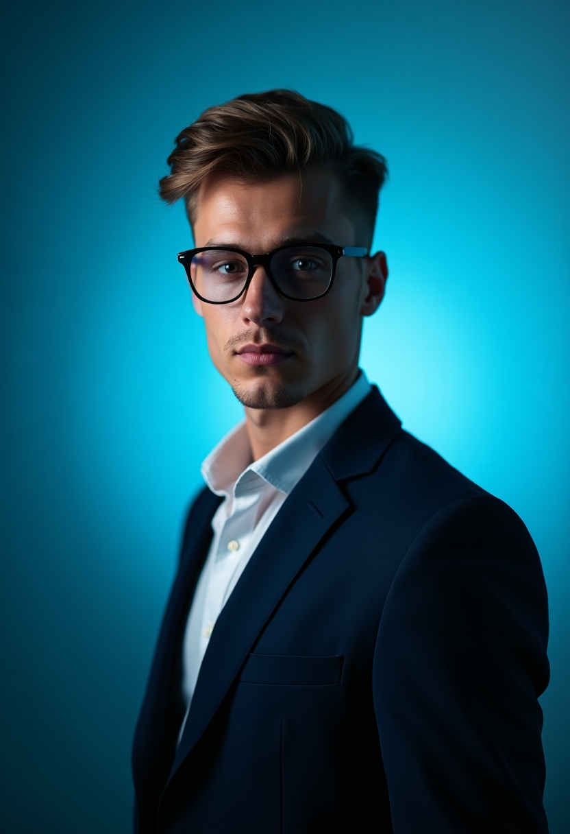Мужчина с профессиональной прической и очками в деловом стиле, на фоне градиентного синего света, прямо смотрит в камеру