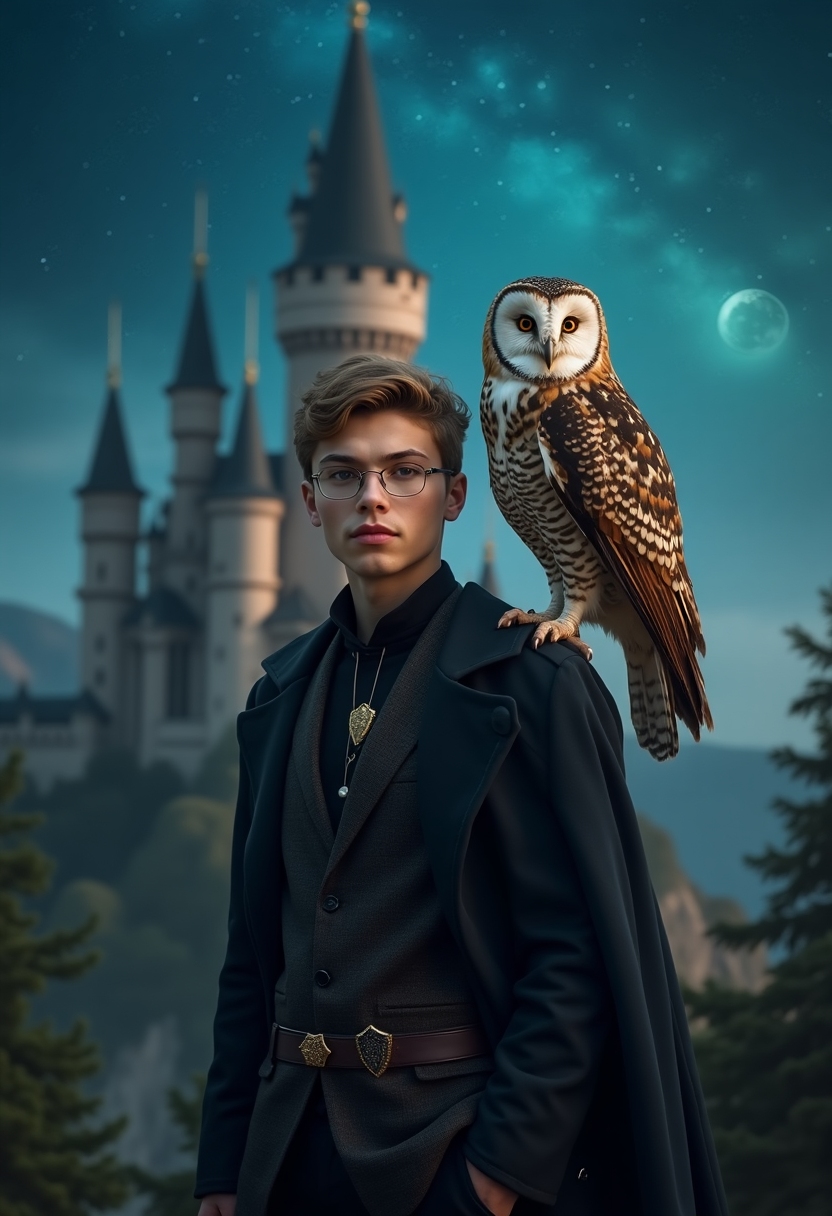 Мужчина с совой на плече стоит на фоне замка, окружённого ночным небом, смотрит прямо в камеру, вокруг летают звёзды