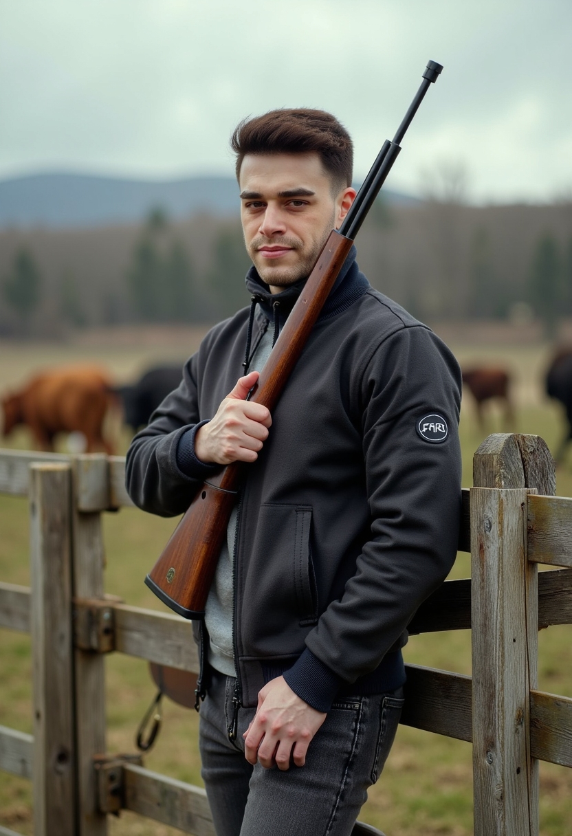Мужчина с винтовкой стоит у деревянного забора ранчо, смотрит прямо в камеру, позади видны коровы