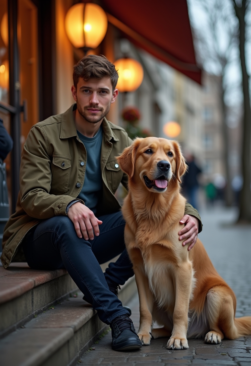 Мужчина сидит на ступеньках уличного кафе, его рука покоится на голове золотистого ретривера, который доверчиво смотрит в камеру. Он слегка наклонил голову, создавая гармонию в кадре. Позади уютный городской пейзаж, мягкий тёплый свет фонарей.