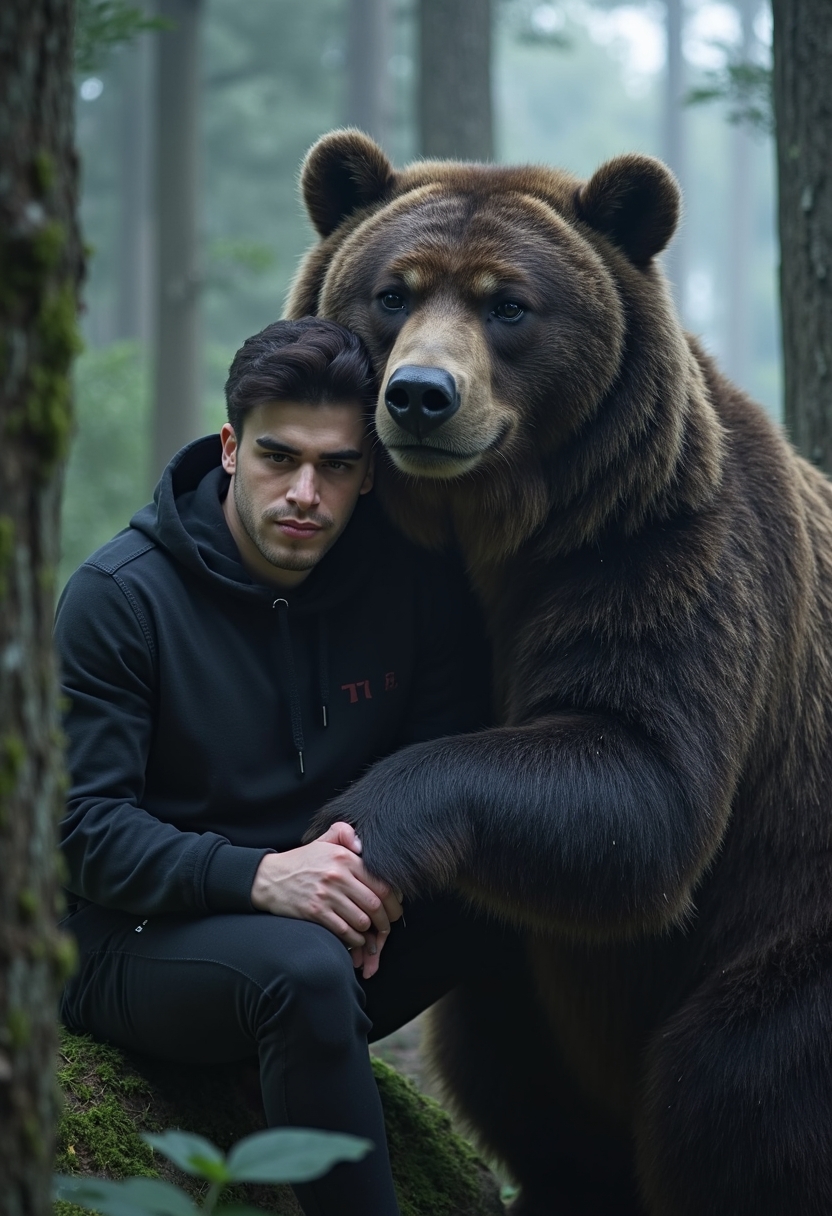 Мужчина сидит рядом с медведем, его рука твёрдо лежит на массивном плече зверя. Они оба смотрят в камеру с серьёзными выражениями лиц. Позади густой лес, пробивающийся сквозь туман. Освещение приглушённое, подчёркивающее мистическую атмосферу.