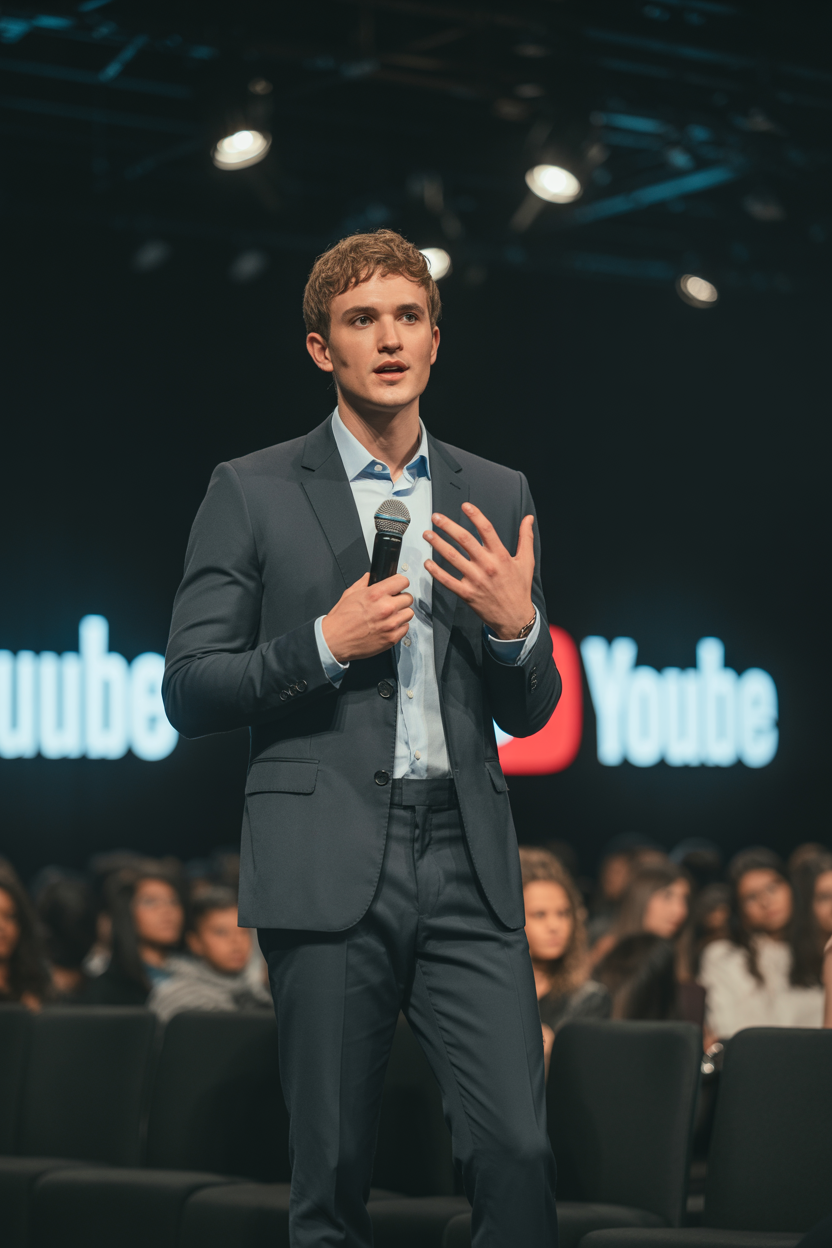 Мужчина-спикер в строгом графитовом пиджаке, черной футболке и стильных брюках, держит микрофон, смотрит в камеру, в фокусе яркие прожектора, сзади толпа и узнаваемый логотип YouTube, а вокруг динамичная атмосфера конференции, средний план.