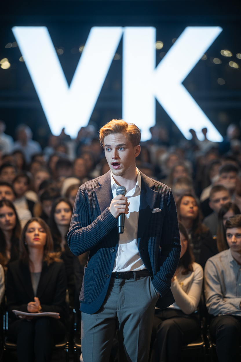 Мужчина-спикер находится на сцене конференции, одет в тёмно-синий трикотажный пиджак, белую сорочку без галстука, классические серые брюки. Держит микрофон и смотрит прямо в камеру, активно разговаривает. Атмосфера погружена в темноту, яркие прожектора, позади логотип VK и размытая аудитория, средний план.