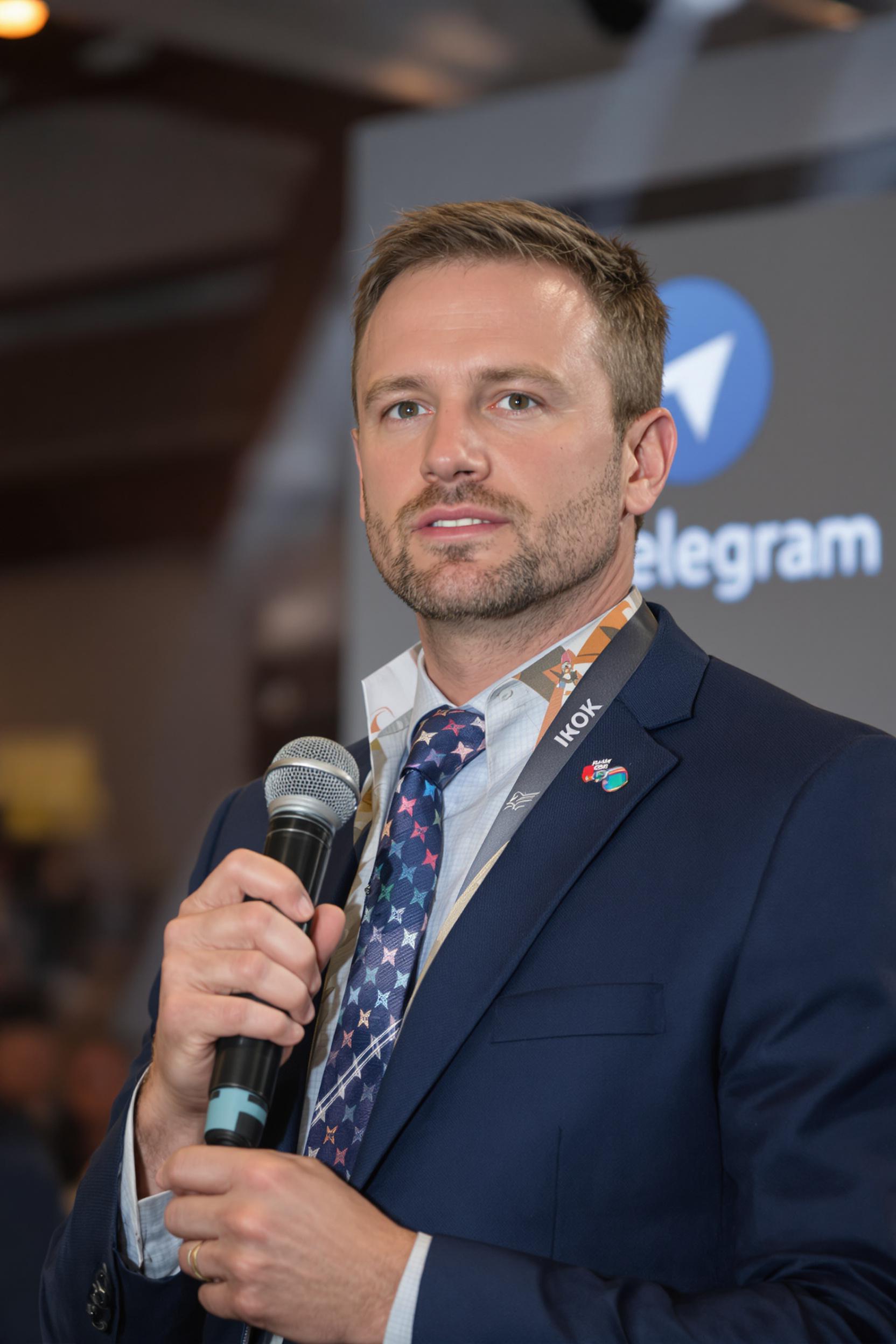 Мужчина-спикер в классическом тёмно-синем костюме и светлой рубашке без галстука, держит в руке микрофон и уверенно говорит, глядя в камеру. Его выделяет свет прожекторов, позади логотип Telegram и размытая деловая публика, средний план.