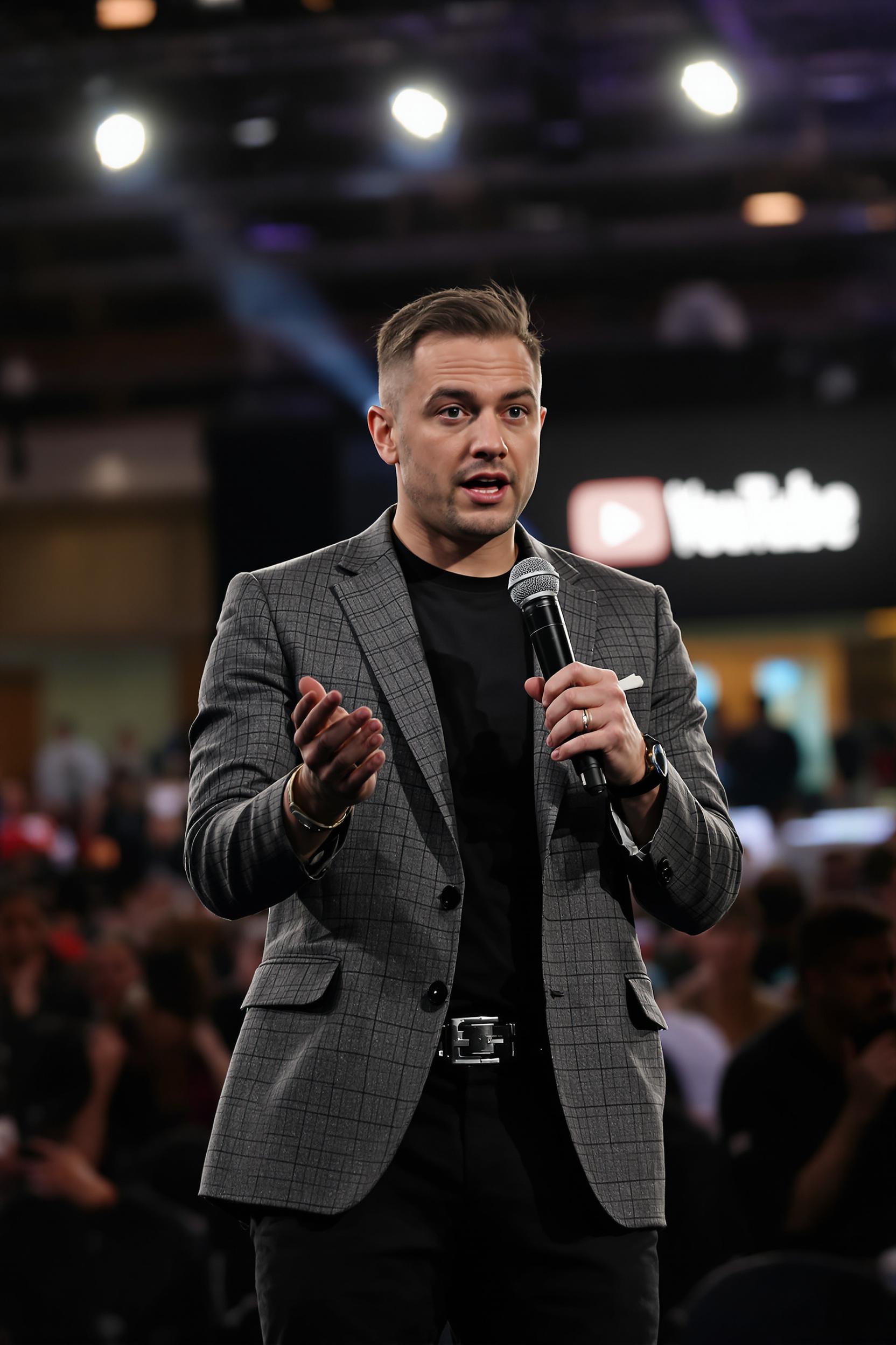 Мужчина-спикер в строгом графитовом пиджаке, черной футболке и стильных брюках, держит микрофон, смотрит в камеру, в фокусе яркие прожектора, сзади толпа и узнаваемый логотип YouTube, а вокруг динамичная атмосфера конференции, средний план.