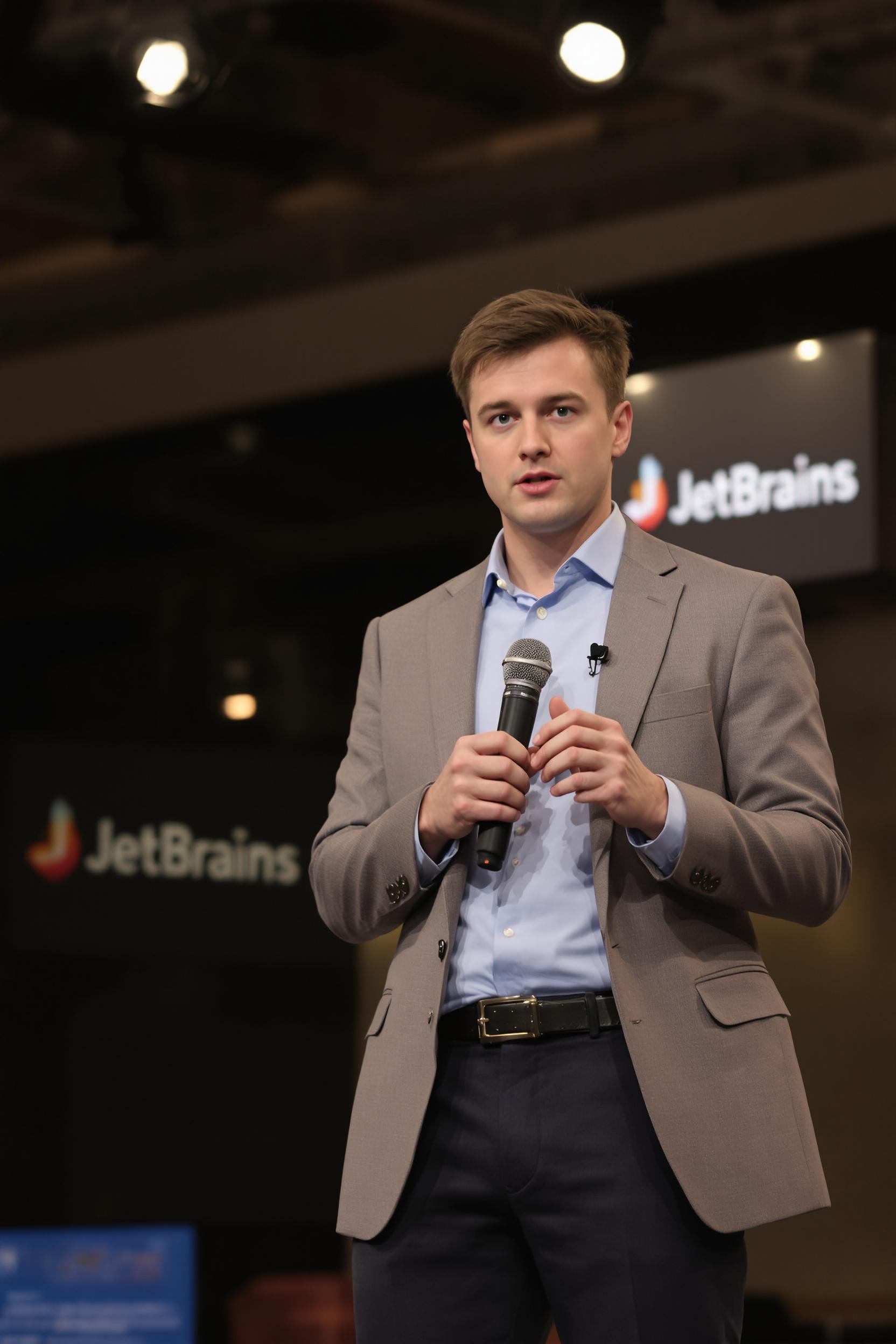 Примерить образ на себеМужчина-спикер в светло-голубой классической сорочке, тёмных строгих брюках и пиджаке, держит в руке микрофон и активно разговаривает, смотря в камеру. Яркие прожектора выделяют его, на заднем плане размытый зал, логотип JetBrains, средний план.