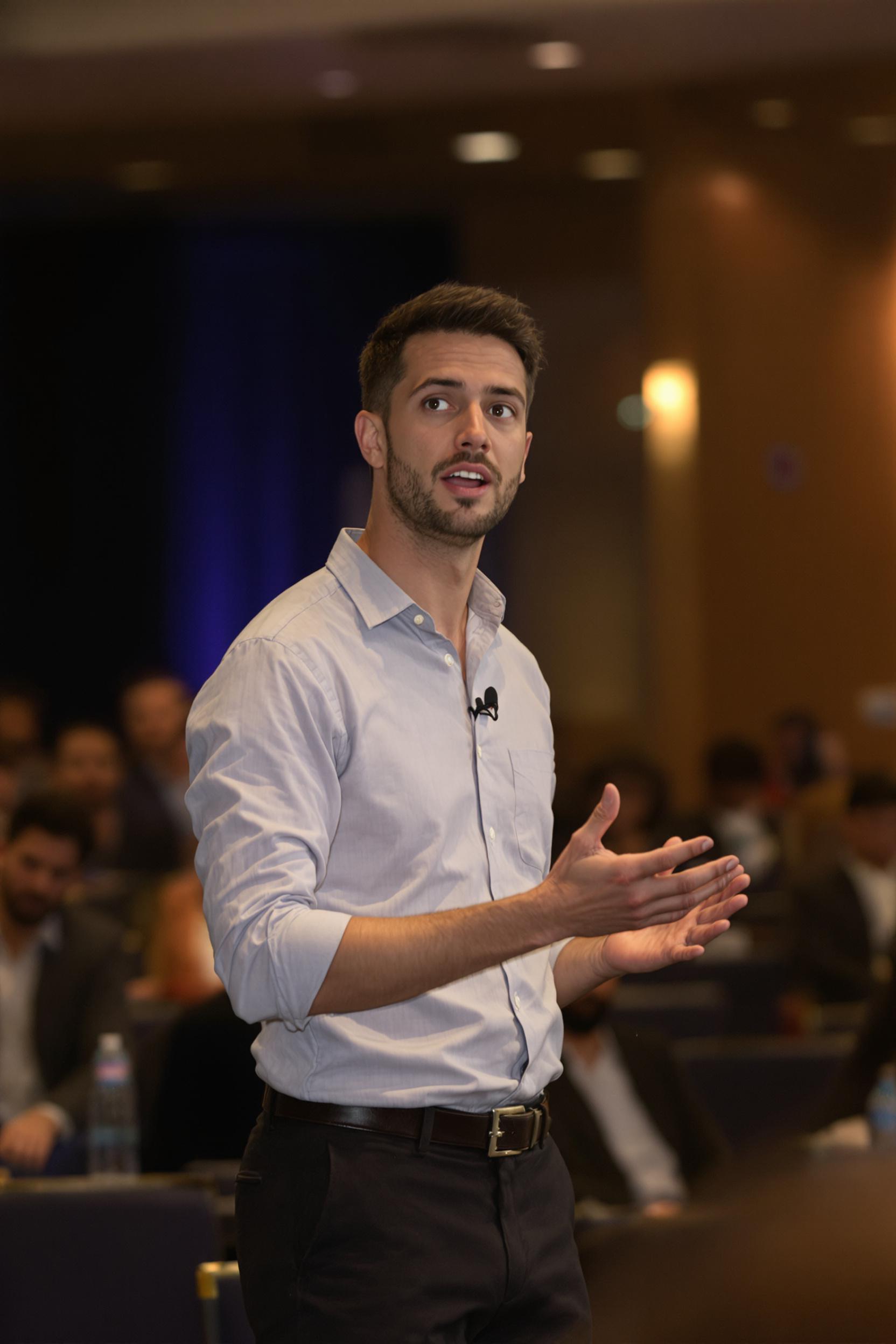 Мужчина-спикер в светло-серой рубашке с закатанными рукавами и темных классических брюках выступает на конференции. Он смотрит в камеру, активно жестикулирует одной рукой, позади размытая аудитория и сцена. Средний план, деловая атмосфера.