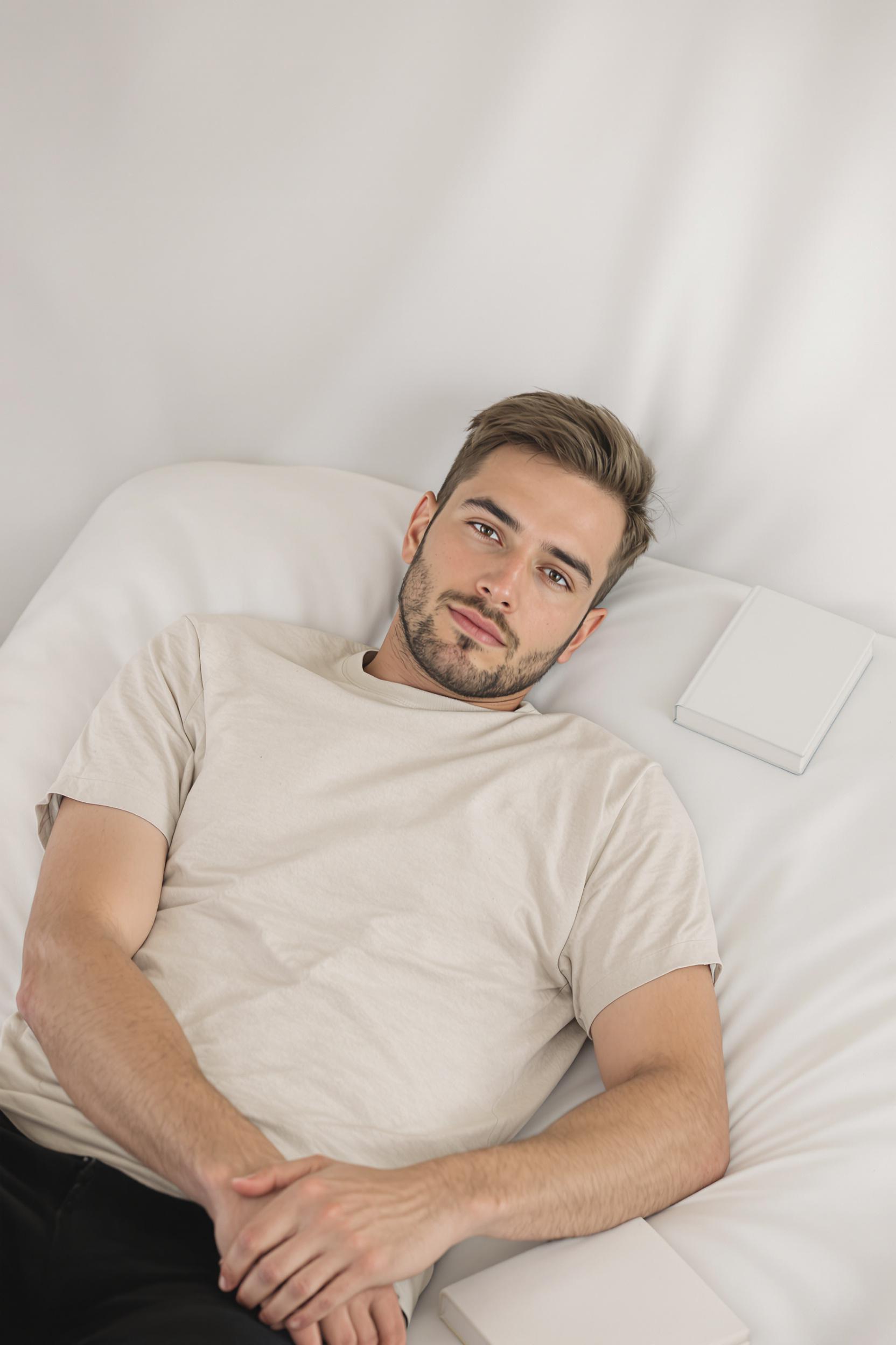 Мужчина в базовой светло-бежевой футболке лежит на боку на белой циклораме, опирается на локоть, взгляд направлен прямо в камеру. Рядом минималистичная белая книга, поза неформальная, свет мягкий, атмосфера уюта и простоты.