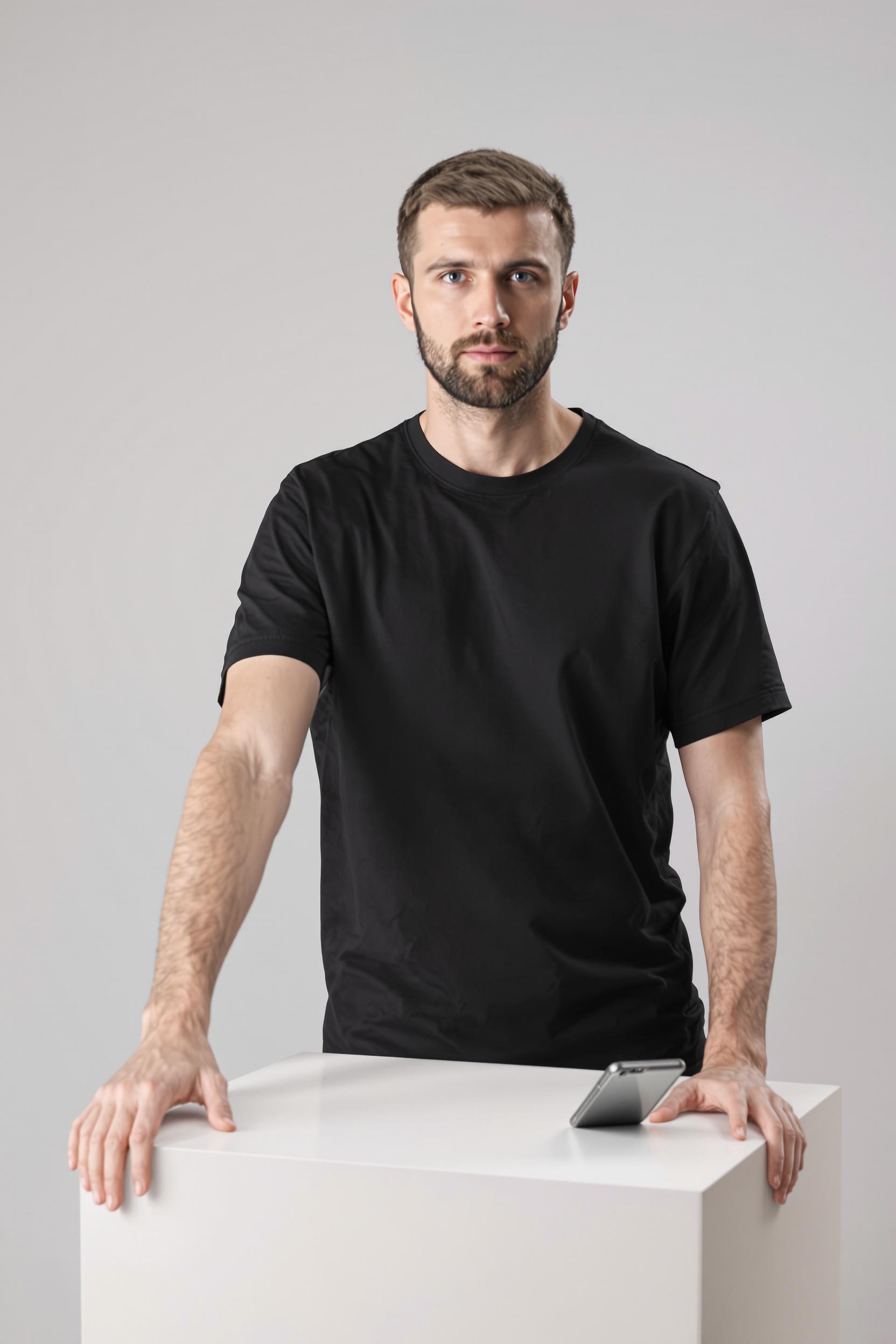 Мужчина в темной лаконичной футболке стоит на циклораме, одной рукой опирается на минималистичный белый куб, второй держит современный смартфон. Смотрит прямо в камеру, поза уверенная, фон чистый, атмосфера минимализма.