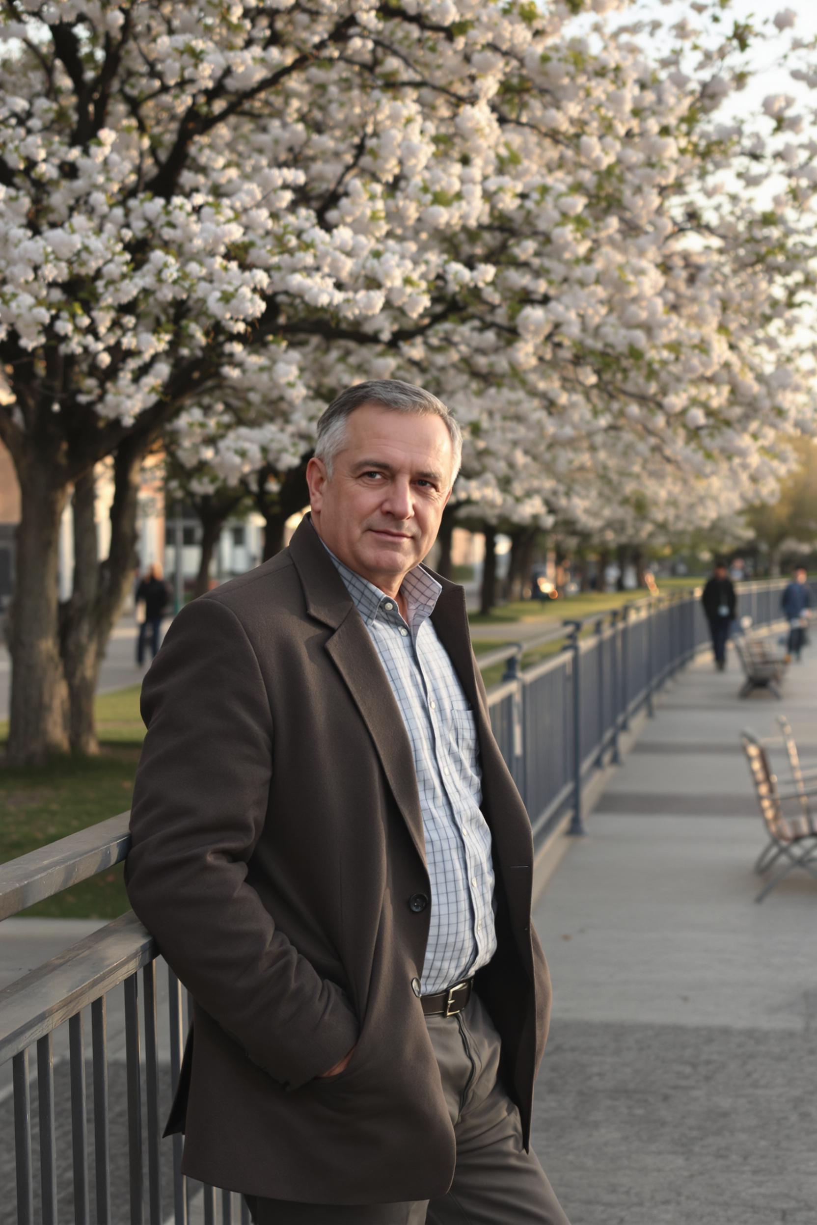 Мужчина средних лет стоит у парапета набережной, спокойно смотрит в камеру, руки в карманах. За его спиной — протяжная линия реки, пешеходные дорожки, скамейки и цветущие деревья, вечернее золотистое освещение, средний план.