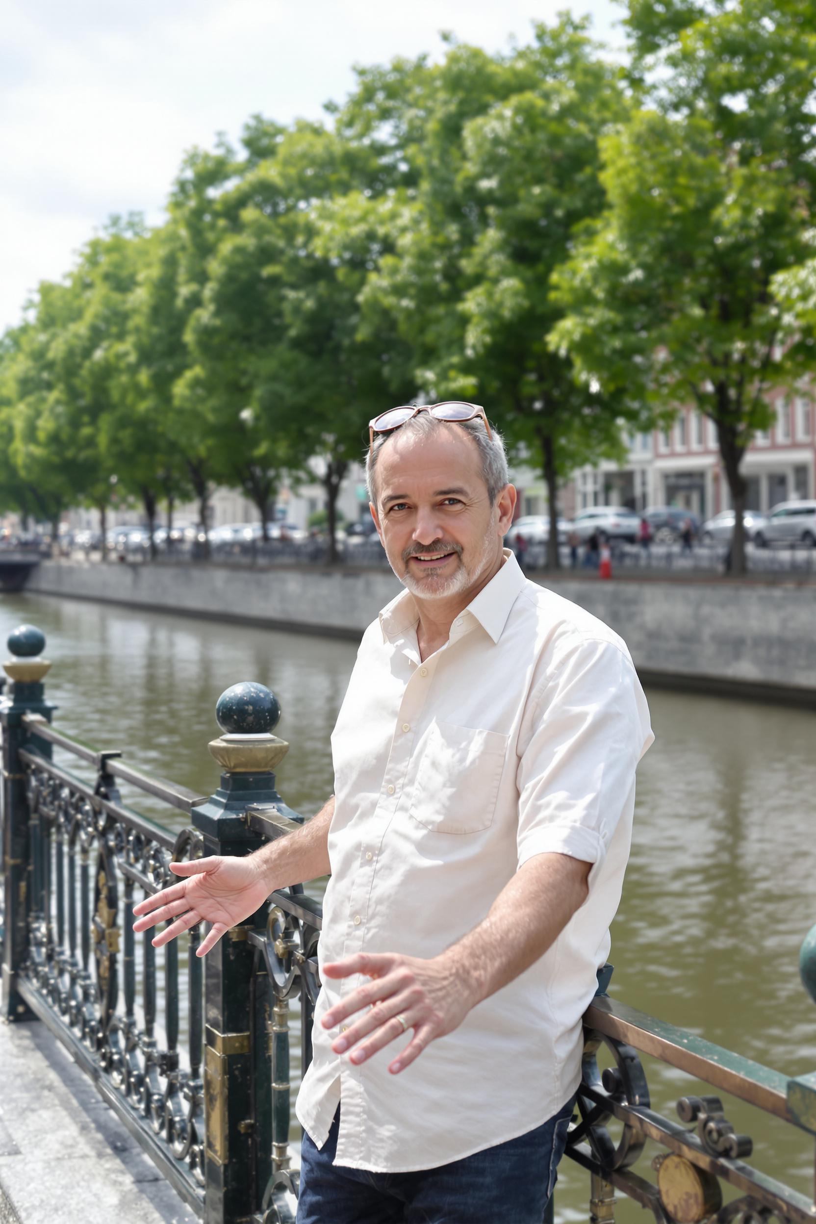 Мужчина средних лет в светлой рубашке стоит у кованого ограждения набережной, обеими руками держится за перила и смотрит прямо в камеру с мягкой уверенностью. Позади — широкая река, ряды деревьев, отражения воды и далёкие городские здания, дневной свет, средний план.