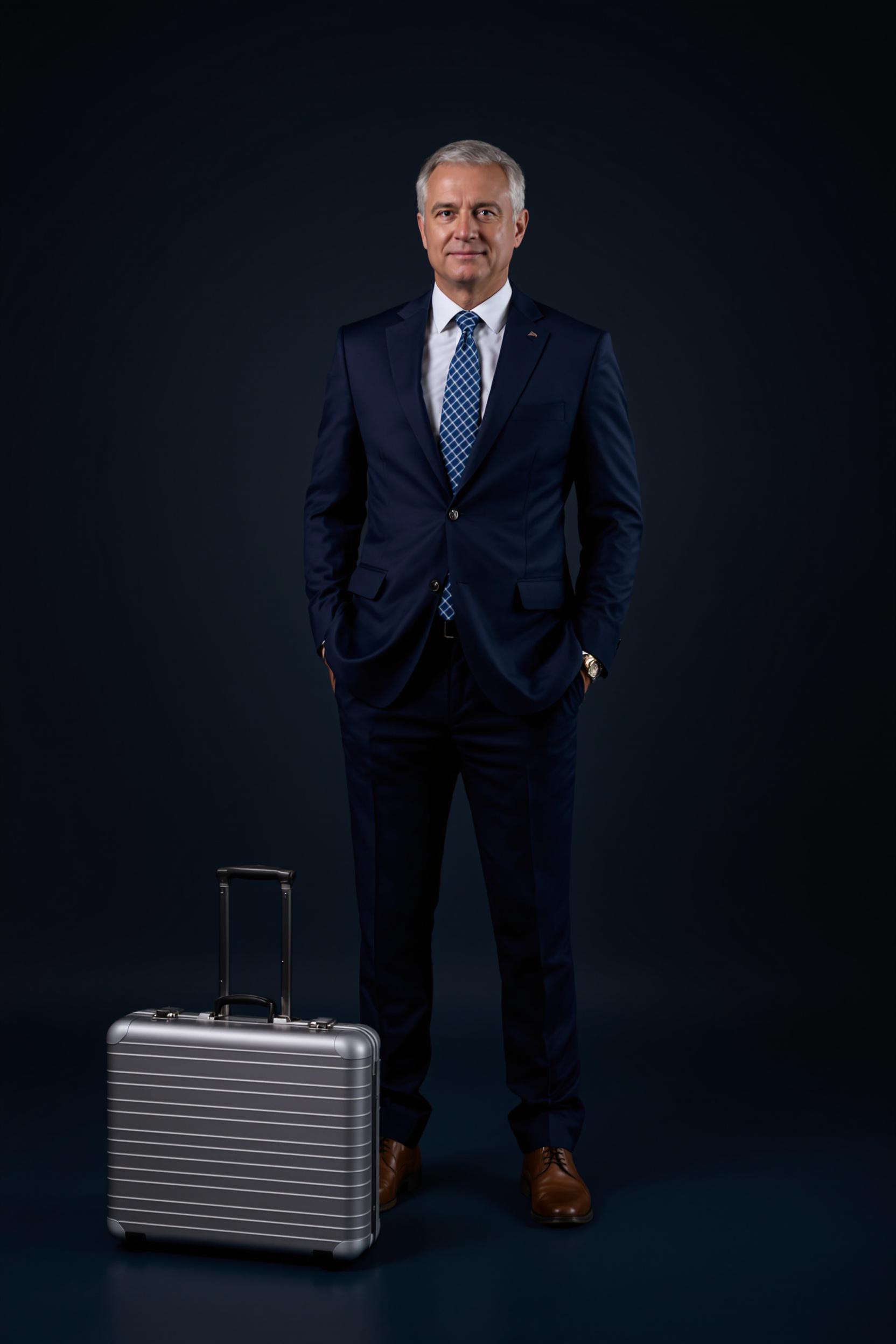 Мужчина средних лет в темно-синем деловом костюме стоит на фоне циклорамы, обе руки находятся в карманах брюк. Он уверенно и прямо смотрит в камеру, поза спокойная, рядом на полу минималистичный металлический портфель, атмосфера деловой строгости.