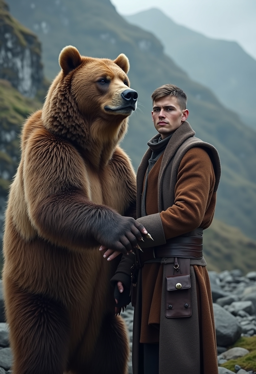 Мужчина стоит бок о бок с бурым медведем, их взгляды направлены в одну сторону, будто они наблюдают что-то вдалеке. Его рука покоится на мощной лапе зверя. Позади дикие скалистые просторы, освещение холодное, подчёркивающее силу образов.