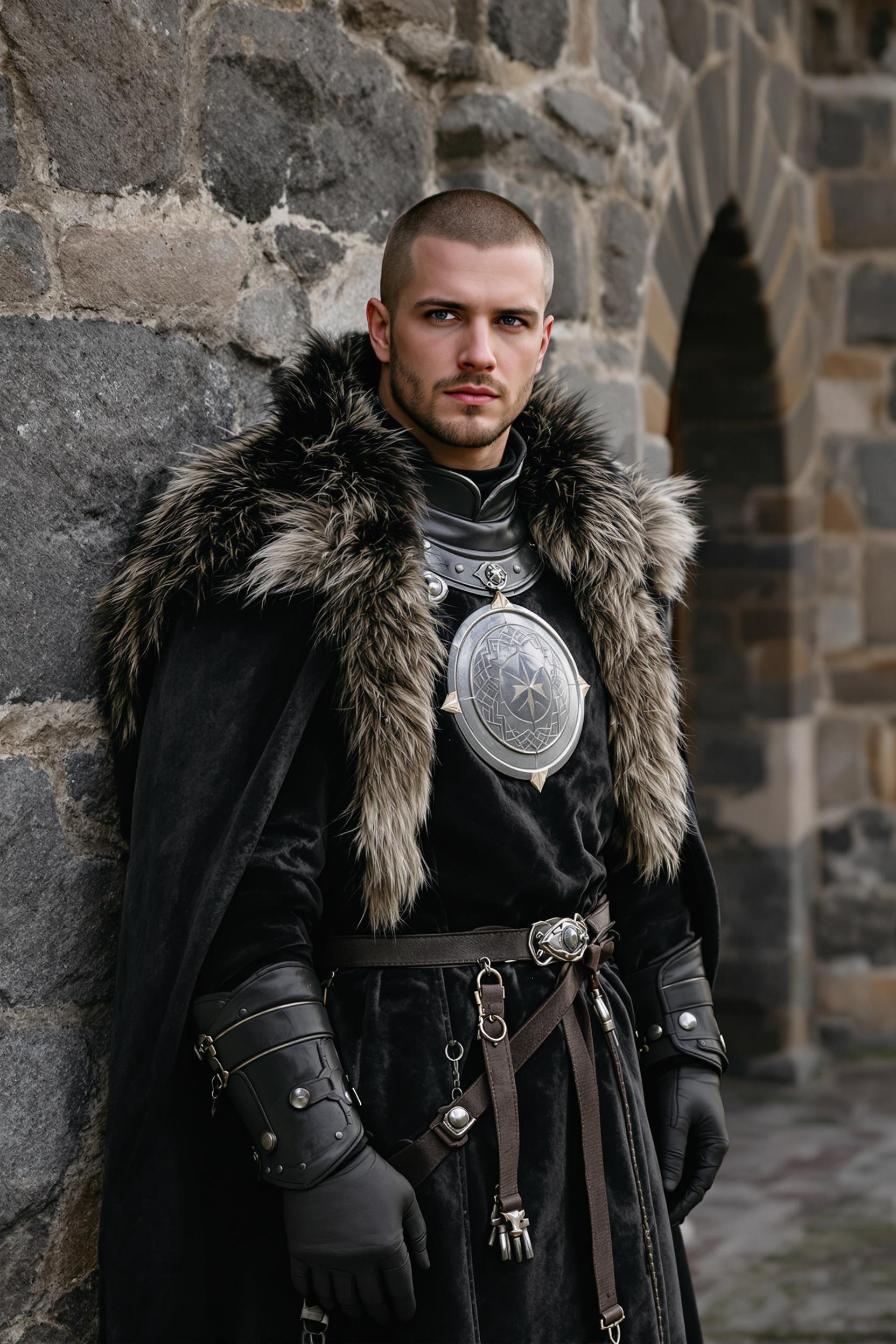 Мужчина стоит на фоне каменных стен средневекового замка, одет в длинный бархатный плащ с меховой отделкой, на плечах искусственно состаренные доспехи, кожаные перчатки, на груди металлический медальон. Мужчина смотрит прямо в камеру, вокруг атмосферный холодный свет.