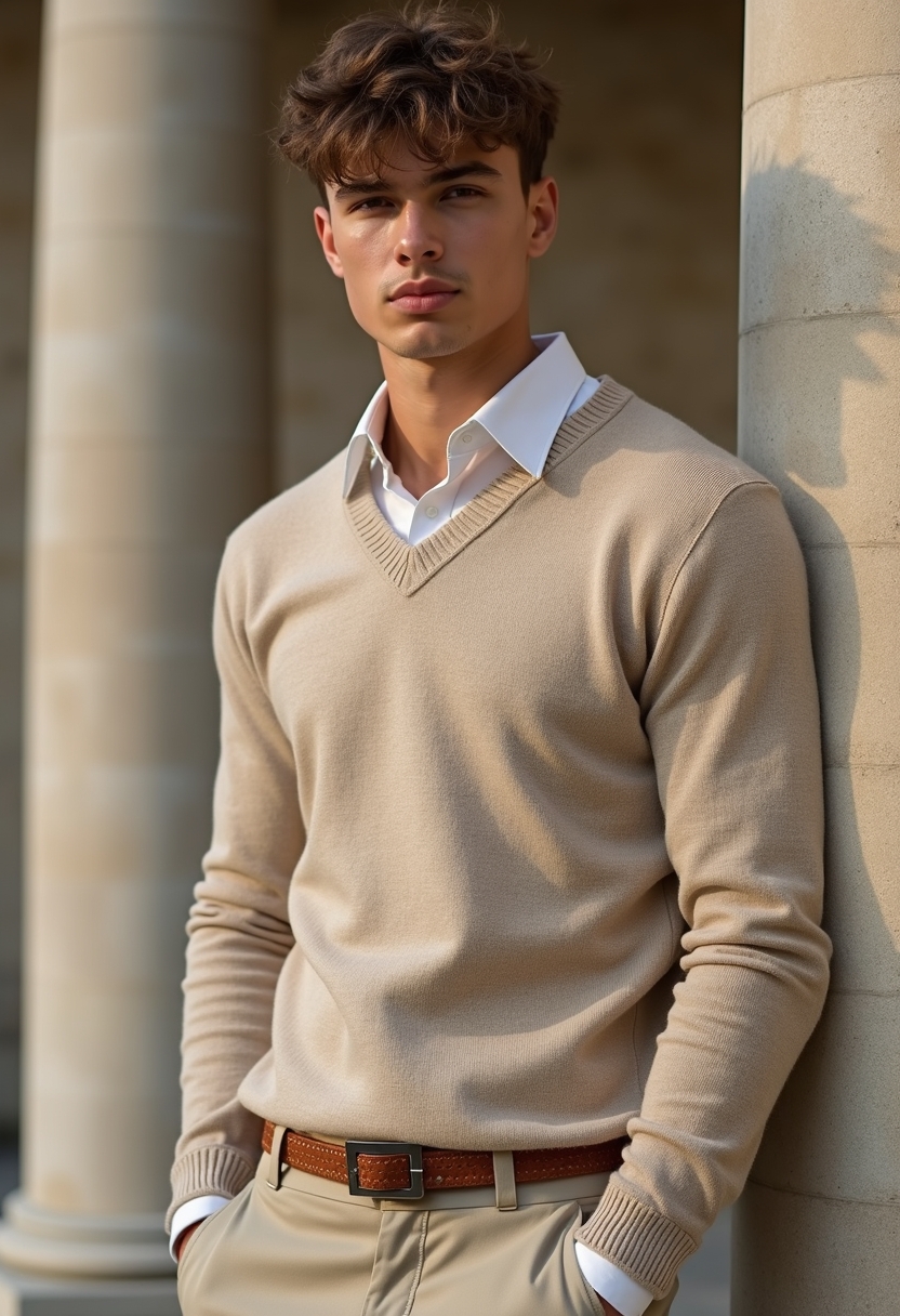 Мужчина стоит, прислонившись к каменной колонне. Он одет в бежевый свитер с длинными рукавами, у горла виднеется воротник белой рубашки и льняные бежевые брюки, подчеркнутые плетеным коричневым ремнем. Одна рука у него в кармане. Крупный план