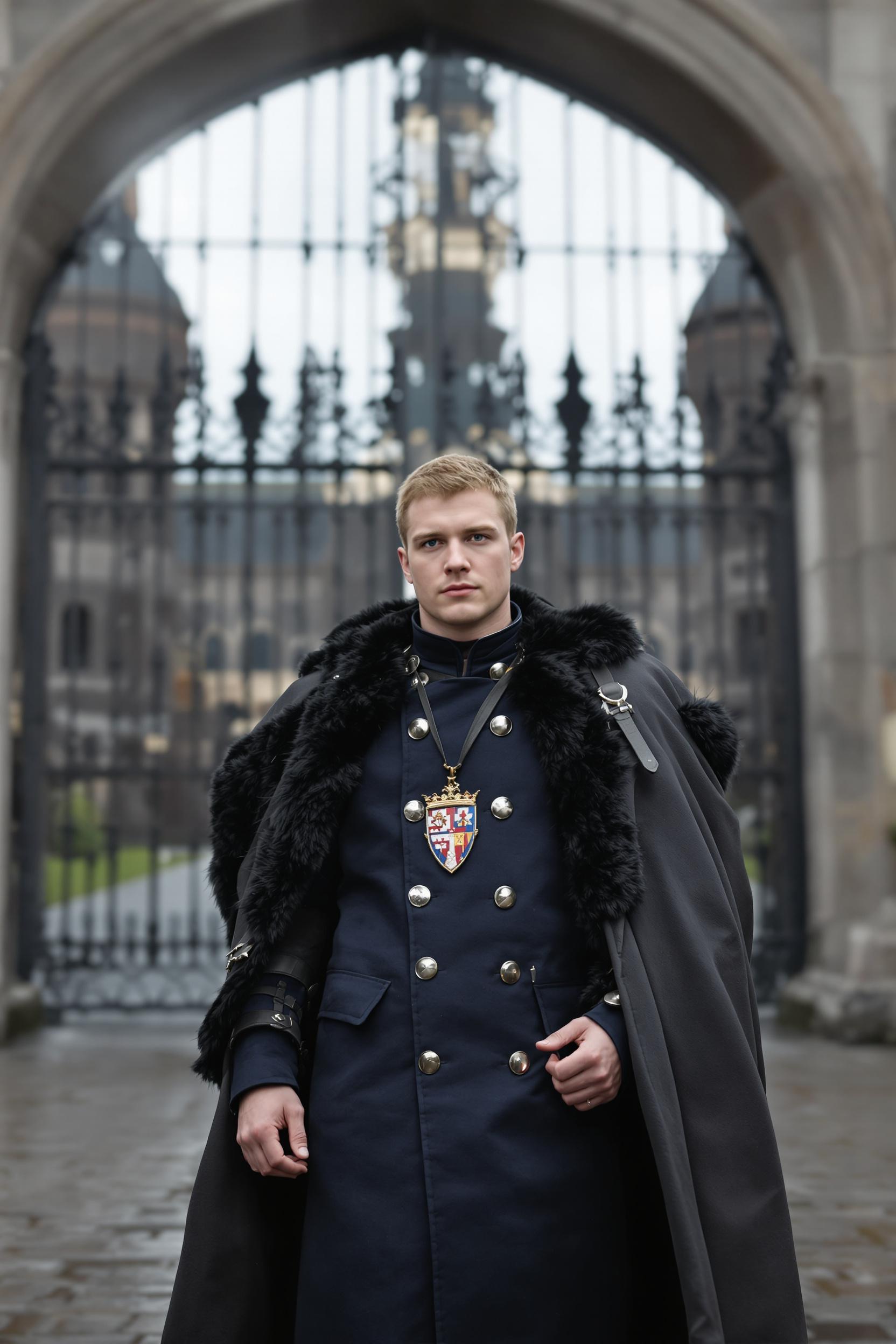 Мужчина стоит у массивных древних ворот, на нем тёмно-синий камзол из плотной ткани с серебряными пуговицами, поверх — чёрный длинный кожаный плащ с меховой опушкой, на груди герб. Мужчина уверенно смотрит прямо в камеру, свет драматичный.