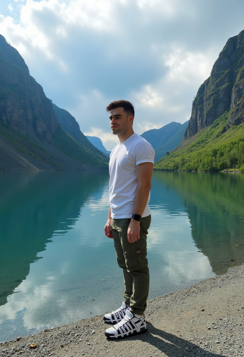 Мужчина стоит у скалистого берега Байкала летом, его взгляд направлен на бескрайнюю водную гладь. Позади скалы и густая зелень, отражающиеся в зеркальной глади озера. Крупный план, акцент на силе и гармонии с природой.