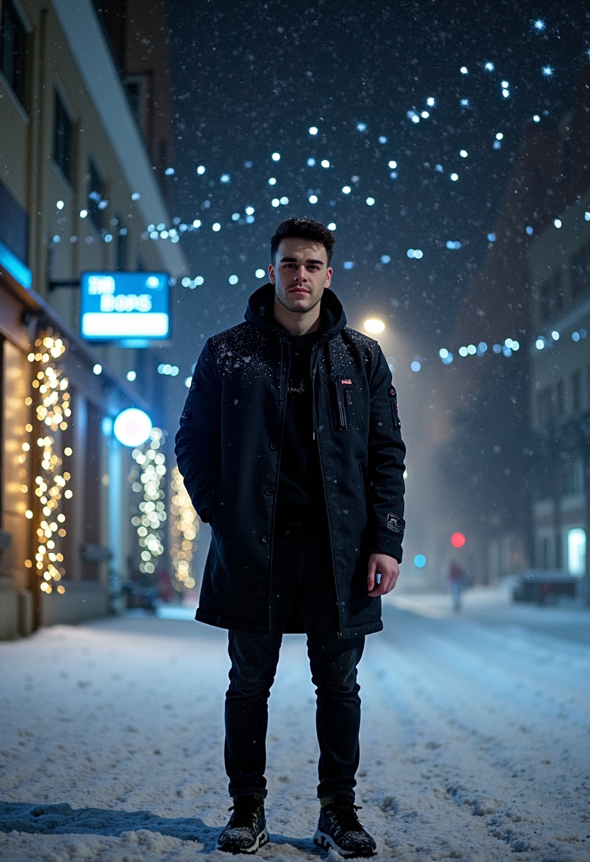 Мужчина, стоящий на улице под звездным небом, окруженный снежными сугробами и сверкающими гирляндами, смотрит в камеру с мистическим выражением, погружая в атмосферу зимней ночи