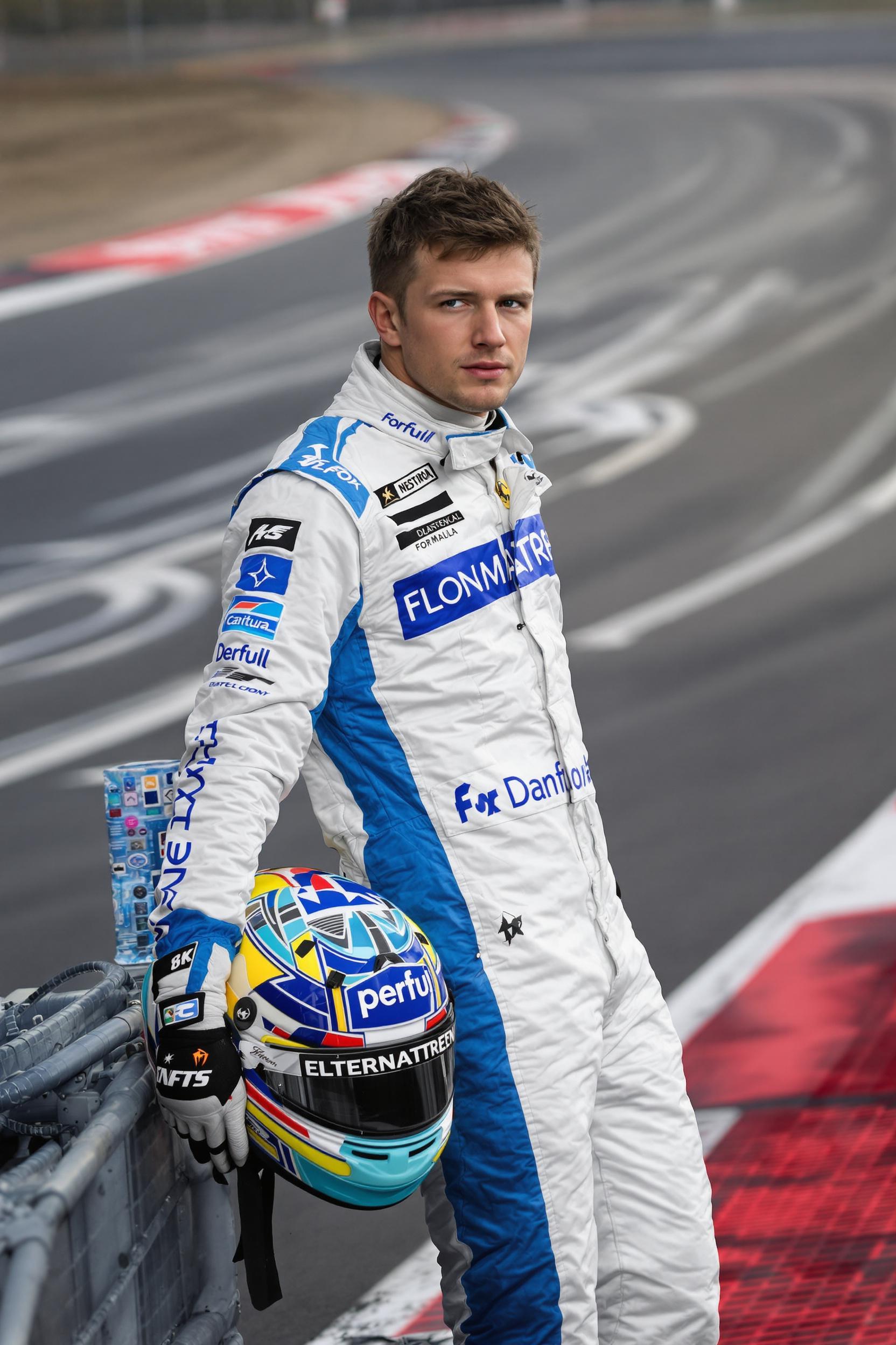 Мужчина в бело-синем комбинезоне пилота Формулы 1 с яркими нашивками и перчатками, стоит на краю трассы, облокотившись на шлем, повернут к камере, за его спиной видны тёмный асфальт и красные бордюры, фон — размытие линий скорости.