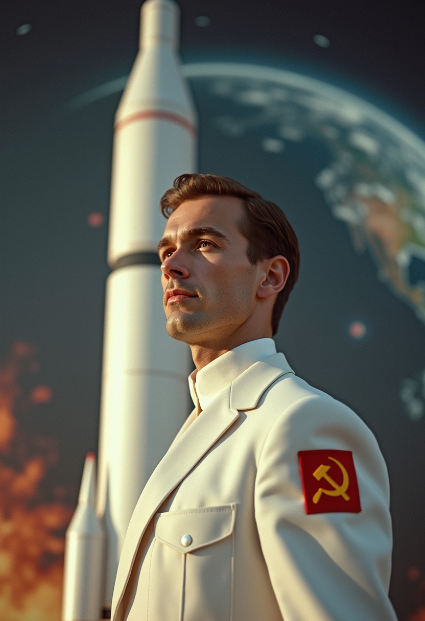 Мужчина в белом костюме с красной нашивкой «СССР» на плече стоит перед моделью ракеты. Он смотрит в сторону с сосредоточенным выражением лица. Позади — символическое изображение Земли из космоса. Крупный план, подчёркивающий героизм и атмосферу 60-х.