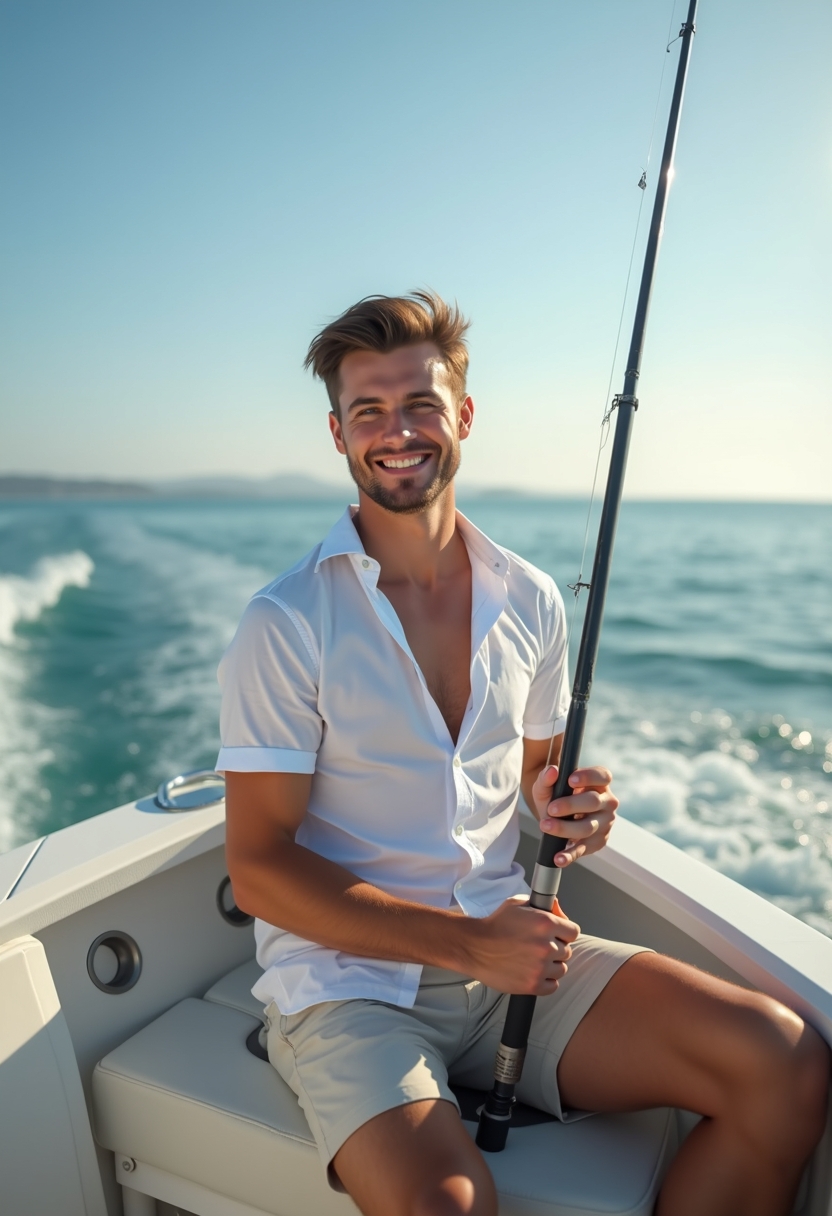 Мужчина в белой рубашке и светлых шортах сидит на корме рыболовной лодки, держит удочку и улыбается в камеру. Позади виднеются волны и солнечный горизонт. Крупный план, акцент на естественности и активном отдыхе.