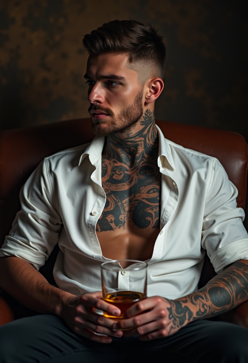 Мужчина в белой рубашке, расстёгнутой на груди, сидит на кожаном диване, его татуировки на груди и шее частично видны. Он смотрит вбок, держа в руках бокал виски. Освещение приглушённое, создающее атмосферу загадочности.