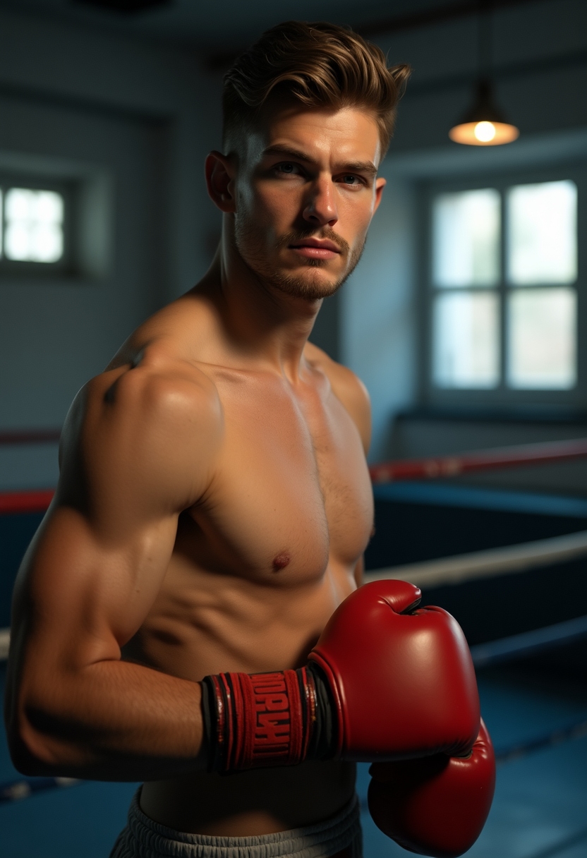 Мужчина в боксерских перчатках стоит в углу ринга, смотрит прямо в камеру, позади размазанные огни зала