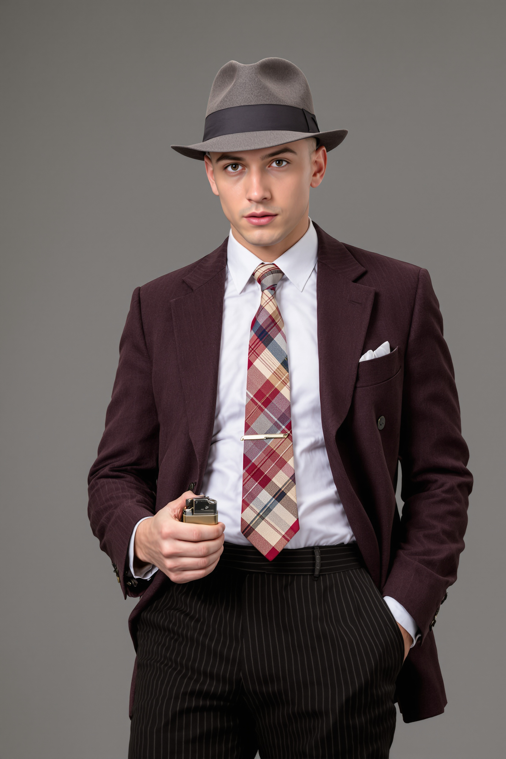Мужчина в бордово-сером двубортном пиджаке, темных брюках со стрелками, белой рубашке и клетчатом галстуке, на голове винтажная шляпа. Стоит, полусогнувшись вперед, в руке — металлическая зажигалка Zippo, крупный план, смотрит прямо в камеру.