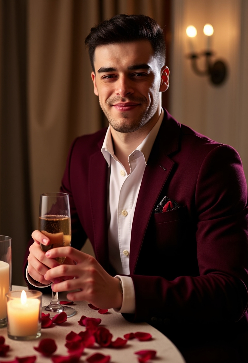Мужчина в бордовом костюме с белой рубашкой стоит у стола, украшенного свечами и лепестками роз. Он держит в руках бокал шампанского и смотрит прямо в камеру с лёгкой улыбкой. Освещение мягкое, акцент на его романтичности.