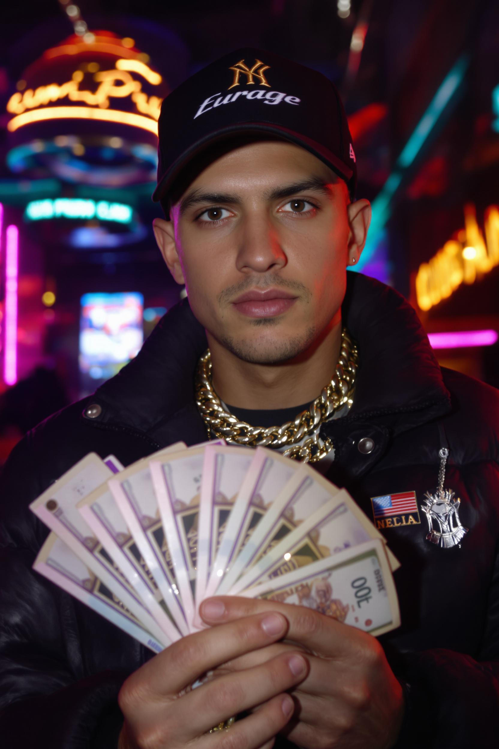 Мужчина в брендовой бейсболке и пуховике, массивная цепь на шее, демонстрирует веер из купюр. Позади — ночной клуб с неоном. Крупный план, акцент на деньгах и статусе.