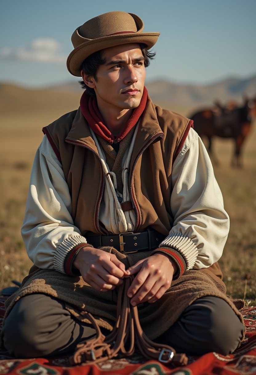 Мужчина в будничной казахской одежде сидит на покрывале, чинит уздечку. Он смотрит вбок, руки в работе. Крупный план, акцент на ремесле и умении жить в степи.