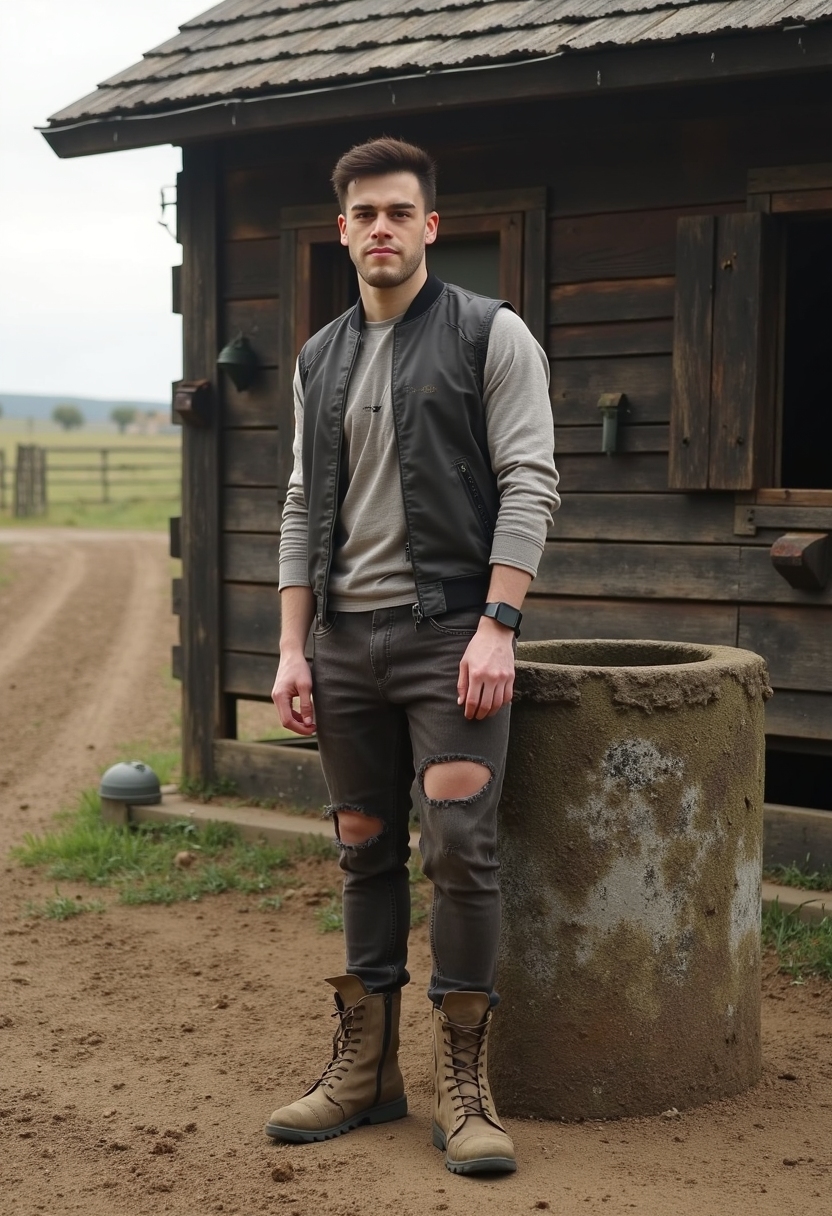 Мужчина в чапсах и кожаной жилетке стоит у старого колодца, прямо смотрит в камеру, вокруг пыльные следы лошадей