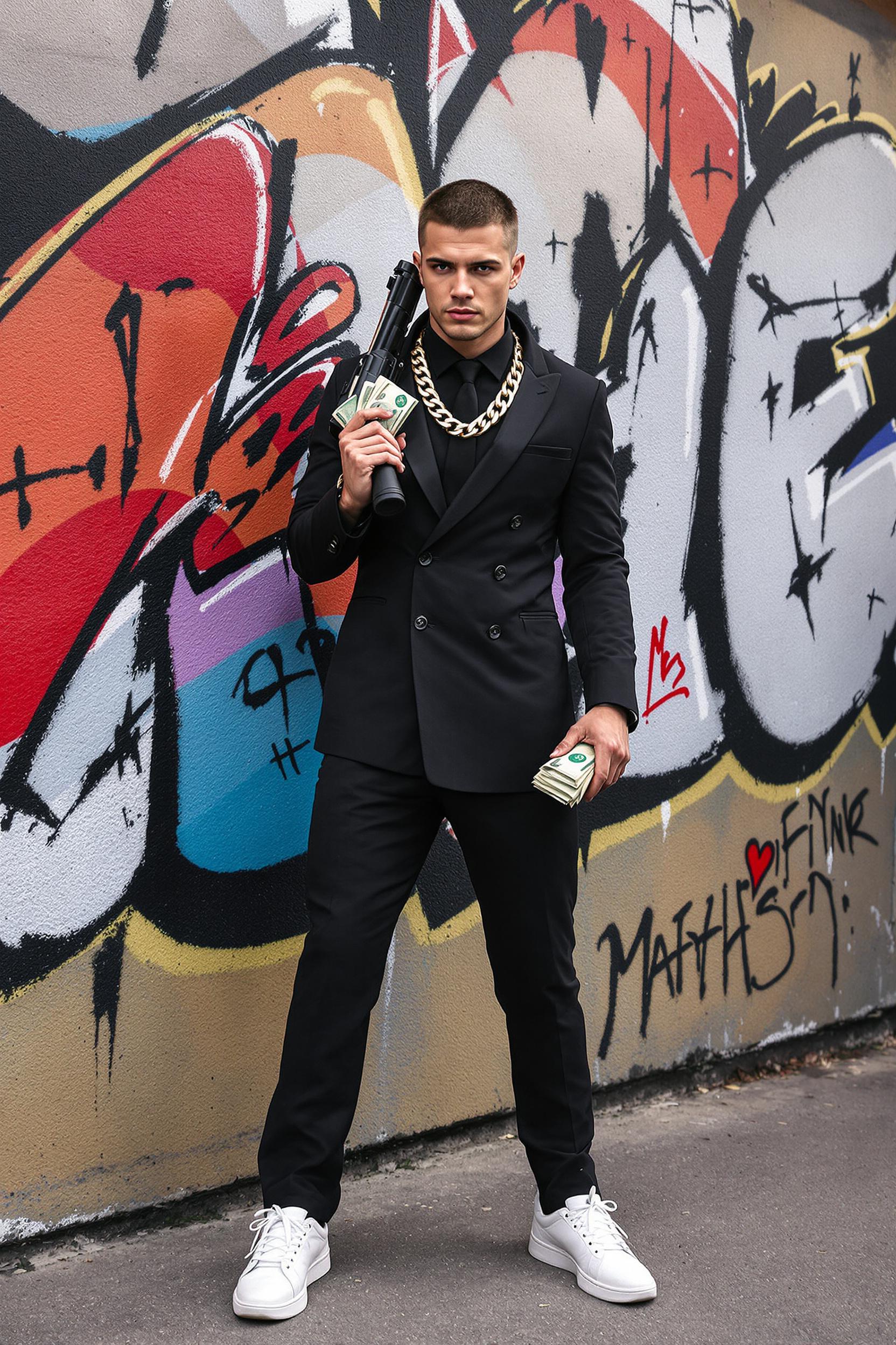 Мужчина в чёрном костюме и белых кроссовках стоит на фоне граффити, в руках держит муляж пистолета и пачку денег. На шее толстая цепь, взгляд жёсткий. Крупный план, пафос и провокация.