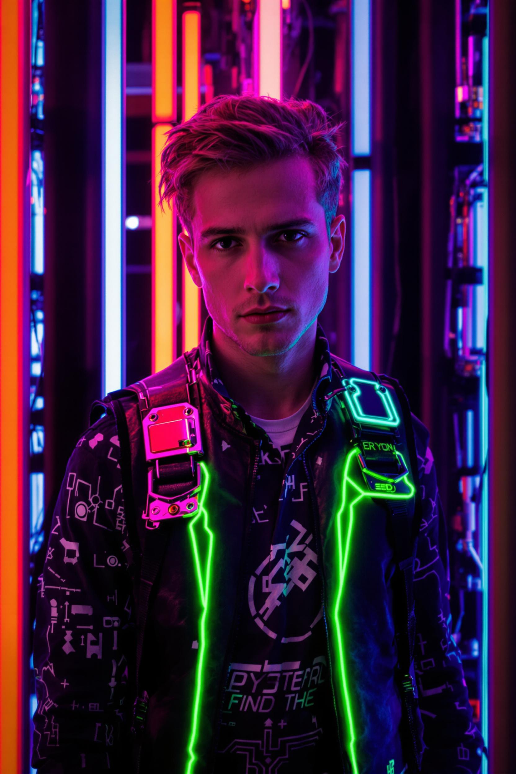 Мужчина в черном кожаном жилете с яркими неоновыми ламинированными элементами, на плече киберпанк-ремни с металлическими вставками, под низом темная рубашка с цифровым узором, позирует на фоне пульсирующих неоновых труб, средний план, прямо смотрит в камеру.