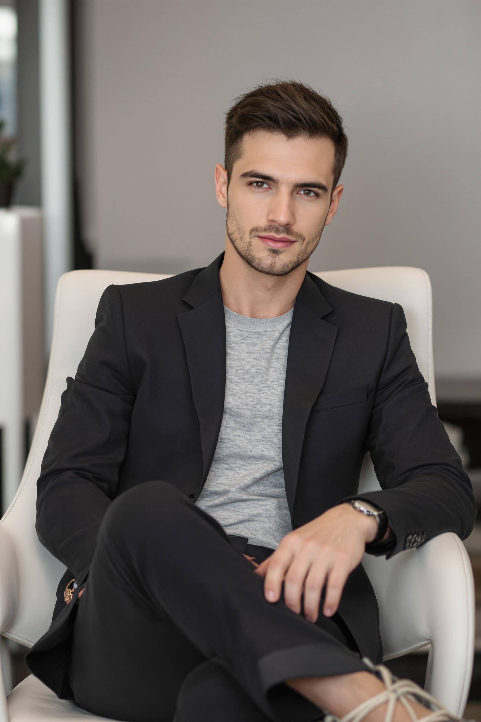 Мужчина в чёрном лаконичном костюме и серой футболке, без галстука и аксессуаров, сидит на подлокотнике минималистичного кресла в кабинете, левая рука на колене, прямо смотрит в камеру, средний план, современная деловая атмосфера.