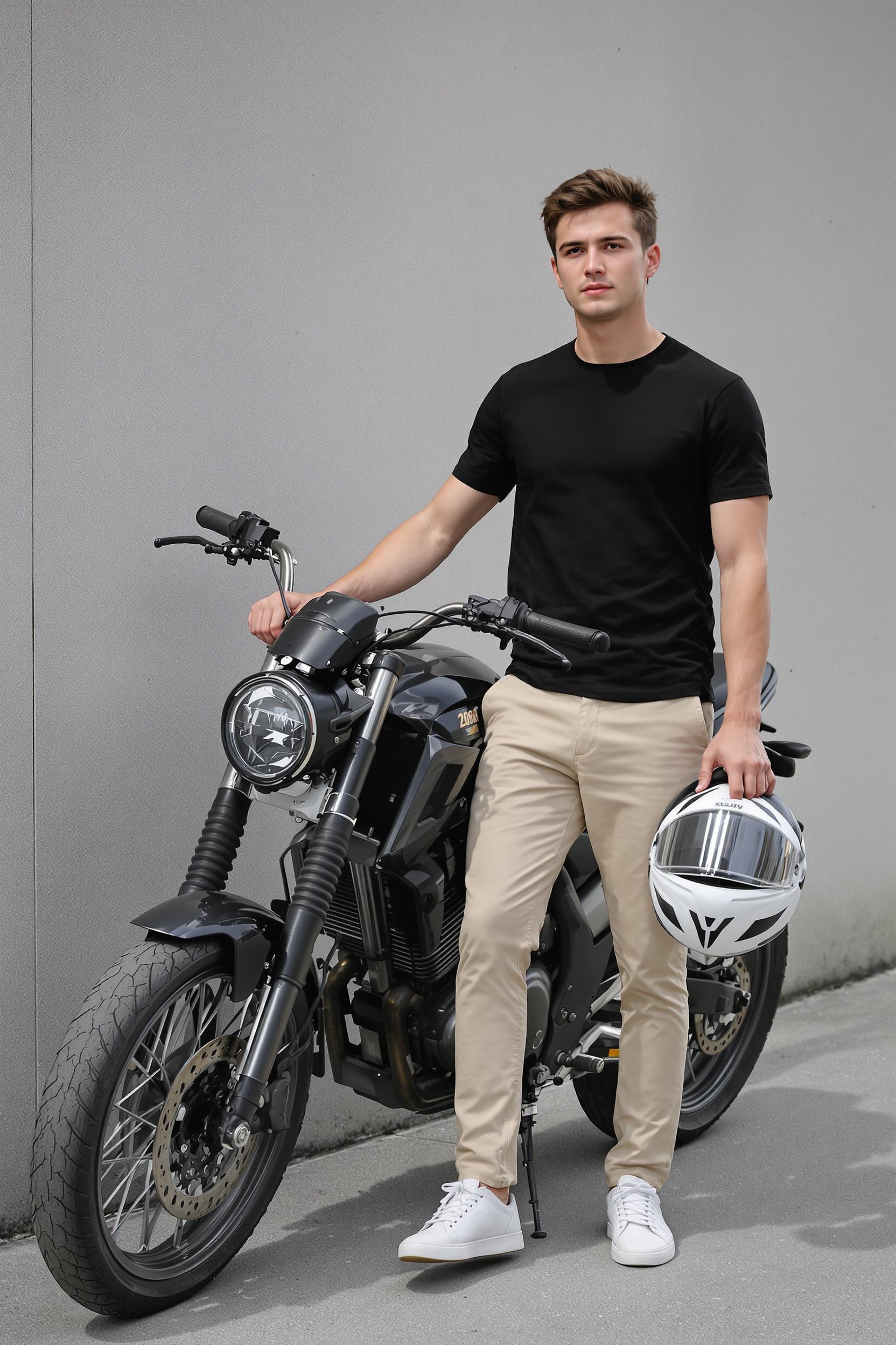 Мужчина в черной базовой футболке, светло-бежевых чиносах и белых кожаных кедах стоит возле монохромного мотоцикла на фоне ровной бетонной стены. В руках мотошлем, уверенный взгляд прямо в камеру, средний план, минимализм.