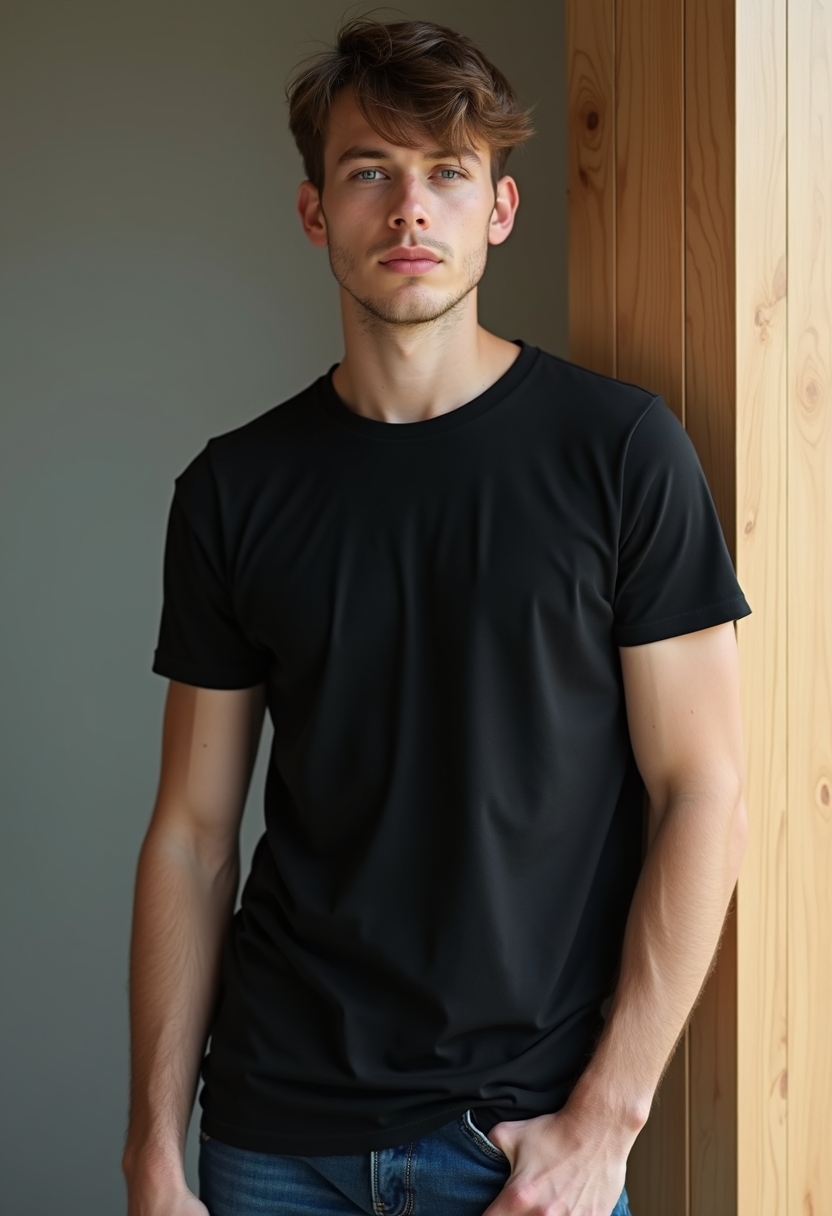 Мужчина в чёрной футболке и джинсах стоит у деревянной панели, за спиной светлый фон с небольшой текстурой древесины.